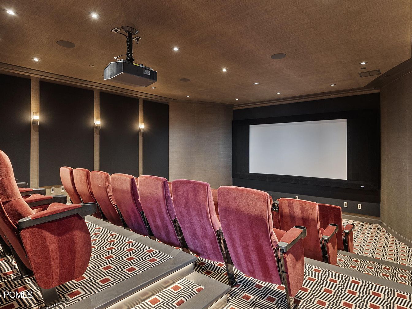 A state-of-the-art home theater features tiered plush seating upholstered in rich burgundy fabric, offering ample comfort and perfect sightlines for every viewer. The bold geometric carpet adds a lively, modern flair, while walls paneled in soft neutrals and black soundproofing details help create an immersive cinematic atmosphere. Soft, recessed lighting and wall sconces deliver just the right ambiance without glare. Spacious arrangement allows families and friends to congregate for movie nights, game days, or entertainment events, making it an ideal family-friendly gathering spot. The large projector and built-in screen promise a true theater experience at home.