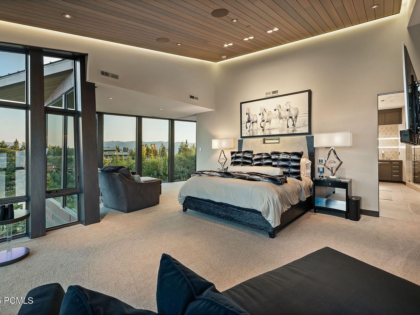 Spacious master bedroom featuring floor-to-ceiling windows that flood the room with natural light and offer stunning outdoor views. The layout includes a sitting area with comfortable armchairs, making it an inviting spot for reading or family relaxation. The décor showcases a neutral color palette with soft beige carpeting, sleek black furnishings, and a statement bed adorned with coordinated pillows. Modern touches, like metallic nightstands with unique lamps, add flair, while the wood-paneled ceiling and recessed lighting enhance warmth and sophistication. Family-friendly features include open space for movement and easy access to the ensuite bathroom, creating a peaceful sanctuary for both privacy and connection.