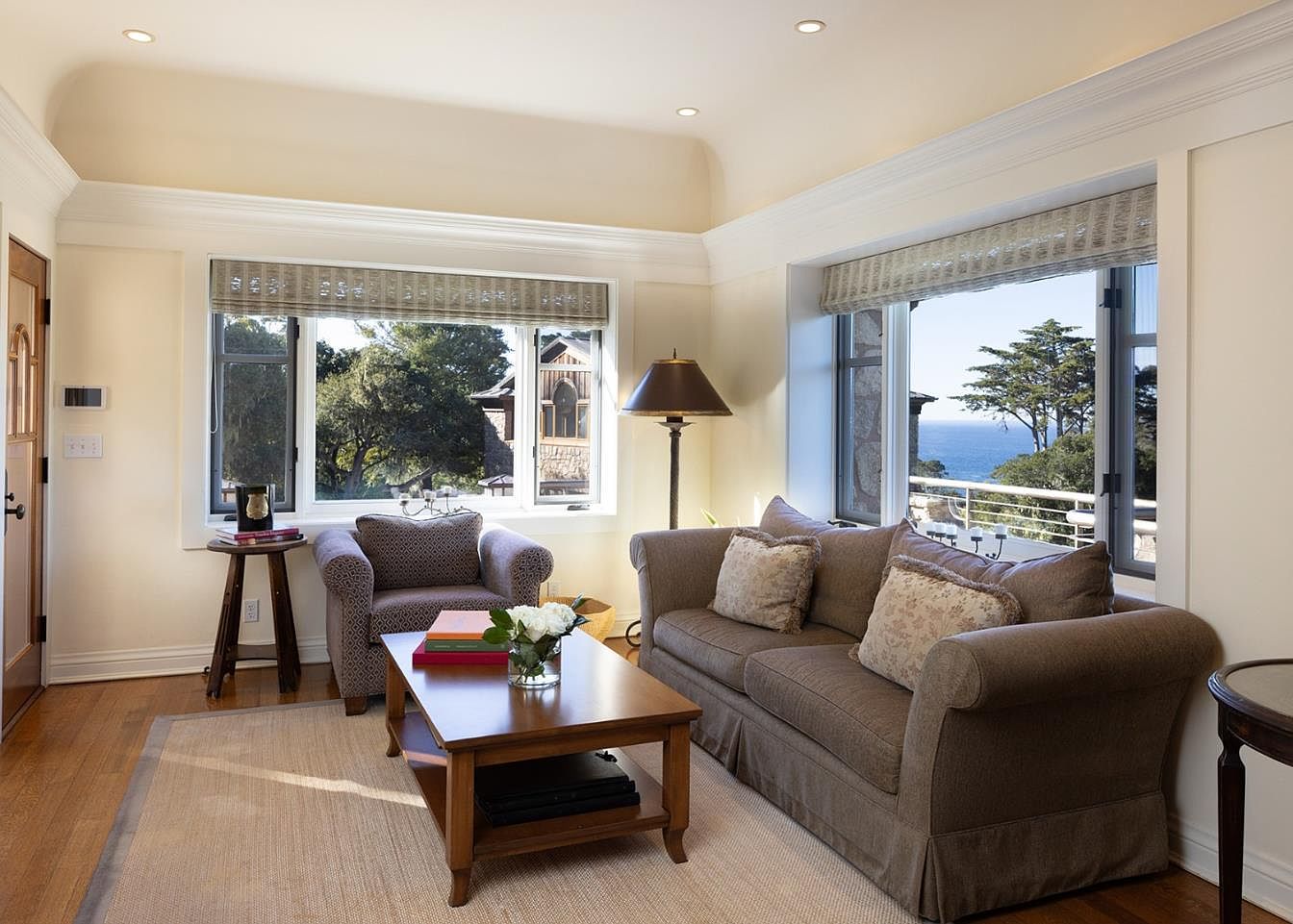Designed for comfort, this inviting living room boasts large windows that flood the space with natural light, framing picturesque views of nature. Neutral tones of soft beige and warm browns create a soothing atmosphere, complemented by plush furnishings including a beautifully upholstered sofa and a patterned armchair. The hardwood floors are elegantly accented by a light area rug, enhancing the room’s warmth, while a wooden coffee table serves as a charming focal point, adorned with colorful books and a fresh floral centerpiece. Thoughtfully placed lighting fixtures and architectural crown molding add a touch of sophistication, making this a perfect gathering space for families.