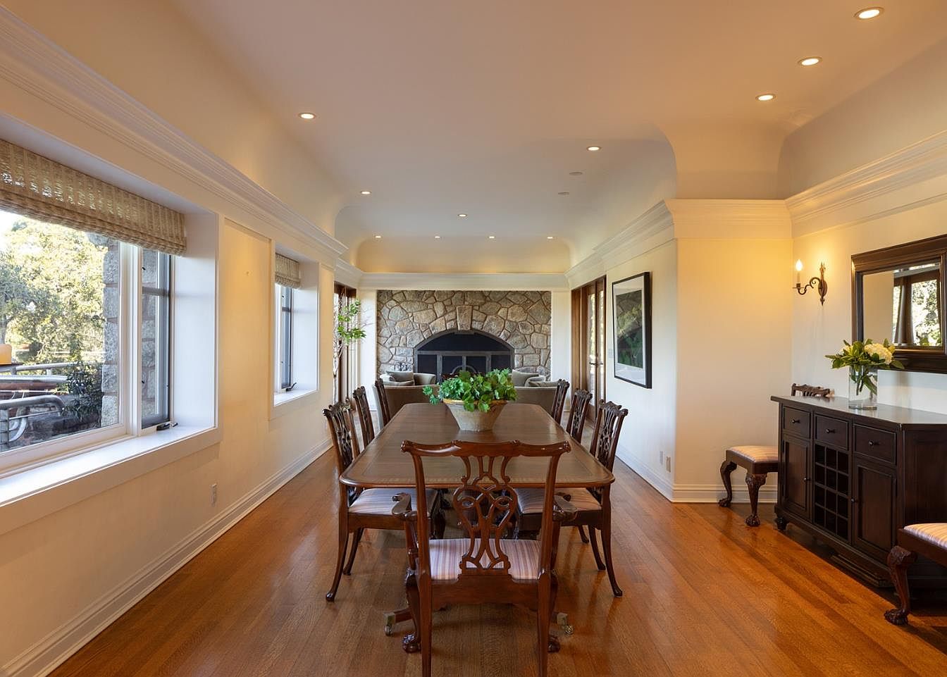 This dining room exudes sophistication and warmth, perfect for family gatherings or intimate dinners. A rich wooden table, surrounded by elegantly designed chairs, invites comfortable seating for guests. The warm wood flooring complements the neutral walls, while large windows flood the space with natural light, enhancing its airy feel. Stylish stonework forms a striking backdrop around the fireplace, serving as a focal point for the room. Natural elements like potted plants add a touch of greenery, and subtle lighting fixtures provide a soft ambiance, creating an inviting atmosphere for cherished moments around the table.
