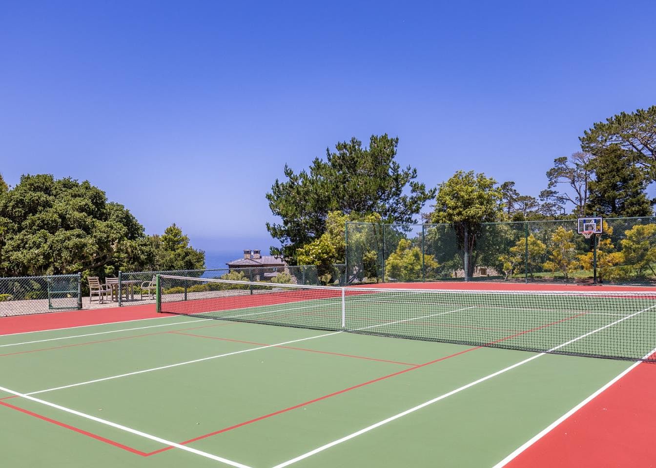 This stunning tennis court is designed for both athletic enthusiasts and families seeking outdoor activities. Nestled amidst lush greenery, the vibrant green and red court offers a perfect backdrop against the expansive blue sky. The dual-functionality includes a basketball hoop positioned nearby, making it ideal for various sports. Surrounding the court, comfortable seating allows for relaxation while watching players in action. The spacious layout emphasizes not only competitive play but also fosters family bonding. Its elevated setting provides breathtaking views of the horizon, creating a serene escape for leisure and recreation.