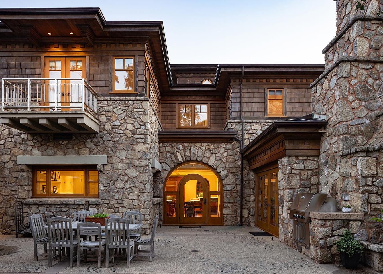 This breathtaking exterior features a beautifully crafted stone facade, merging elegance with rustic charm. The expansive multi-level layout showcases large windows that invite natural light, framed by intricate wood accents. A grand staircase leads down to a luxurious pool adorned with a playful slide, perfect for family fun and entertaining. Lush landscaping surrounds the home, enhancing its private feel while offering inviting outdoor spaces. Warm, ambient lighting highlights architectural details as dusk approaches, creating a serene atmosphere. The harmonious blend of materials and textures emphasizes warmth and sophistication, making it an ideal haven for relaxation and gatherings.