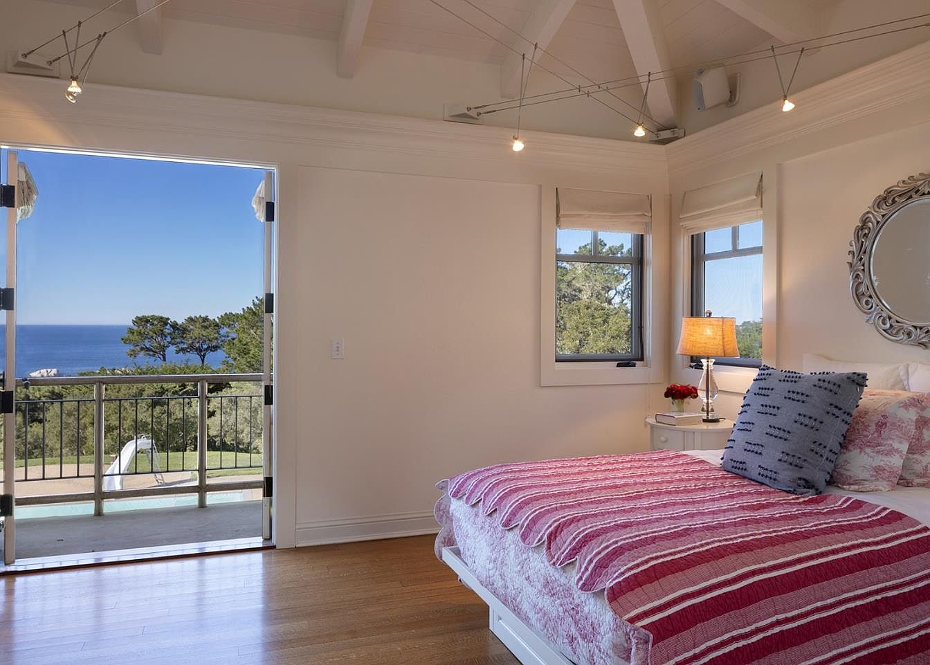 This serene master bedroom features a spacious layout enhanced by vaulted ceilings and strategically placed windows that frame stunning ocean views. Light wooden flooring adds warmth, while a soft color palette of whites and gentle pastels creates a calming atmosphere. The plush bed is adorned with a stylish striped blanket and decorative pillows, inviting relaxation. A charming bedside lamp rests on a sleek nightstand, providing soft lighting for evening reading. Access to a private balcony through double French doors allows for seamless indoor-outdoor living, perfect for enjoying morning coffee or evening sunsets with loved ones.