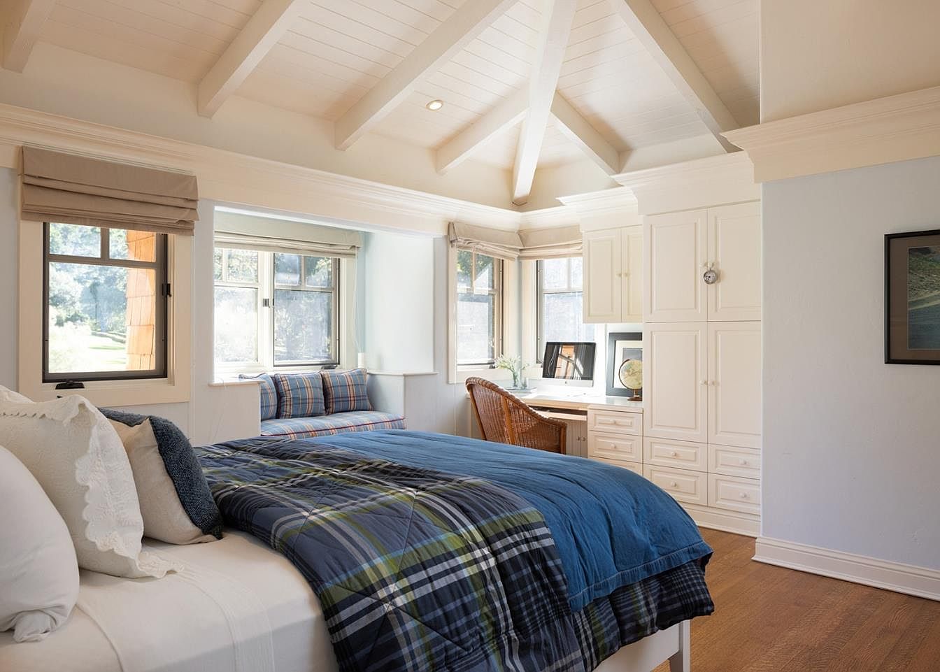 This inviting bedroom features a charming blend of aesthetic appeal and functional design, highlighted by a cozy alcove with stylish windows allowing natural light to fill the space. Warm tones create a soothing atmosphere, while textured bedding, including a blue plaid quilt, adds comfort and warmth. A built-in desk offers a practical workspace, complemented by a comfortable wicker chair. The vaulted ceiling with exposed beams enhances the spacious feel, while the combination of plush pillows and a cushioned bench invites relaxation. This family-friendly area perfectly balances comfort with style, making it an ideal retreat for rest and creativity.