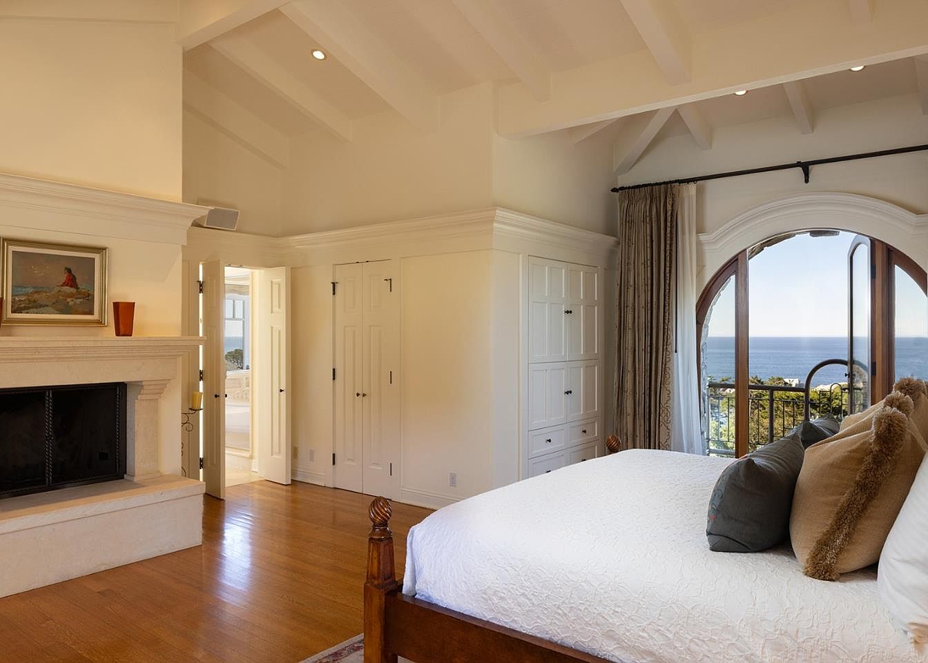 This master bedroom boasts an elegant design with vaulted ceilings and warm hardwood floors, enhancing its spacious appeal. A cozy fireplace serves as a central feature, offering a perfect spot for relaxation. The calming color palette, composed of soft whites and natural wood tones, cultivates a serene atmosphere. Large arched windows frame breathtaking ocean views, inviting natural light and fresh air. Custom cabinetry provides ample storage while maintaining a clean aesthetic. Plush bedding and decorative pillows add comfort and sophistication, making this space an inviting retreat for rest and rejuvenation.