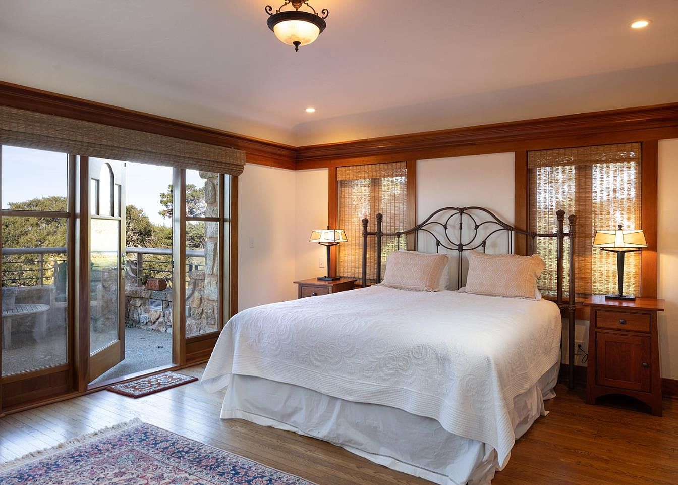 This master bedroom features a serene layout, accentuated by warm wooden tones that create a cozy atmosphere. The inviting queen-sized bed, draped in a textured white quilt, serves as the focal point, flanked by elegant wooden nightstands with stylish lamps. Expansive windows adorned with natural woven shades offer abundant natural light and frame stunning views of the outdoors. The rich hardwood floors add warmth, complemented by a delicate area rug that enhances the space’s comfort. French doors provide access to a private outdoor balcony, perfect for morning coffee or evening relaxation, making it an ideal family-friendly retreat.