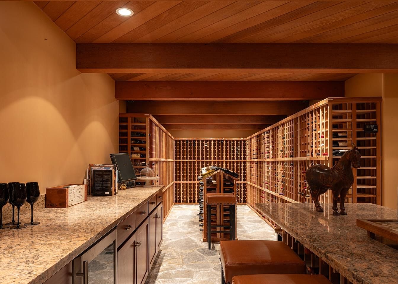 This elegant wine cellar features rich wooden shelving designed to showcase an extensive wine collection, accompanied by polished granite countertops that provide ample space for tasting and entertaining. The warm color palette, with soft golden hues on the walls, creates an inviting atmosphere, while the natural stone flooring enhances a rustic charm. Comfortable bar stools invite relaxation, and smart storage solutions make the space both functional and stylish. Exposed wooden beams add architectural interest, completing this cozy retreat perfect for family gatherings or intimate gatherings, blending luxury with comfort in a beautifully designed environment.