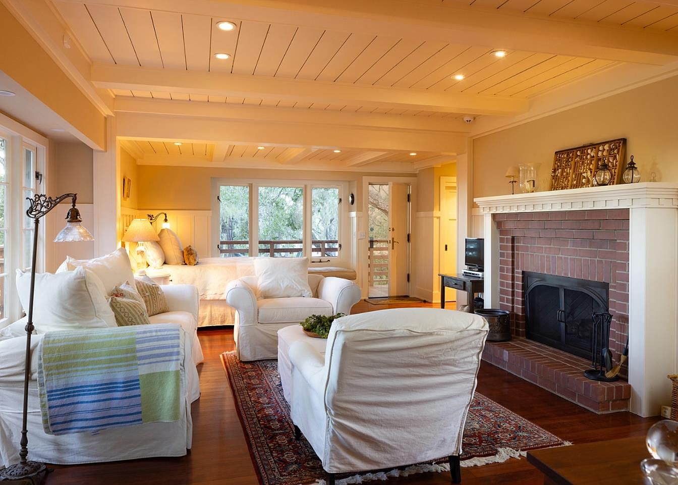 This cozy living room features an inviting layout with ample natural light pouring in through expansive windows, creating a warm and bright atmosphere. Soft, white slipcovered sofas provide comfort, accented by a plush, colorful area rug that adds warmth to the hardwood flooring. The room’s color scheme combines soft beige walls with white trim and exposed wooden beams, offering a rustic elegance. A charming brick fireplace serves as a focal point, perfect for family gatherings. Thoughtfully placed lamps and decorative accents enhance the space, making it a perfect retreat for relaxing or entertaining.