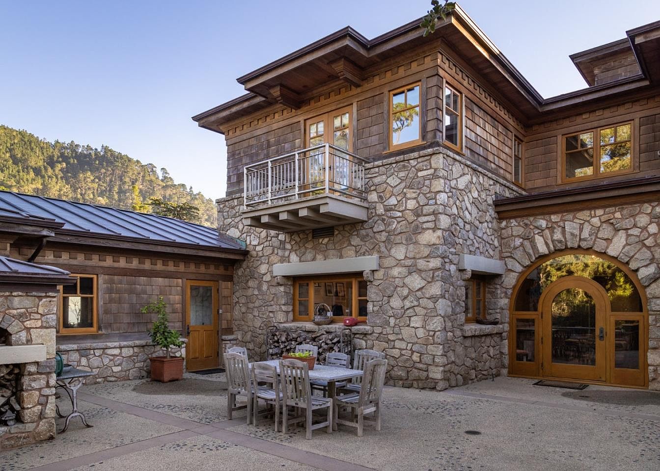 This charming outdoor area highlights a rustic yet inviting aesthetic, featuring a natural stone façade complemented by warm wooden accents. The spacious patio is designed for family gatherings, complete with a sturdy wooden dining set that encourages al fresco meals amidst nature. Expansive glass windows allow abundant natural light, while the balcony above offers a lovely vantage point. The landscape is adorned with potted plants, enhancing the inviting feel. Thoughtfully placed elements like the outdoor fireplace offer both comfort and style, making this space a perfect blend of functionality and rustic charm, ideal for family relaxation and entertaining.
