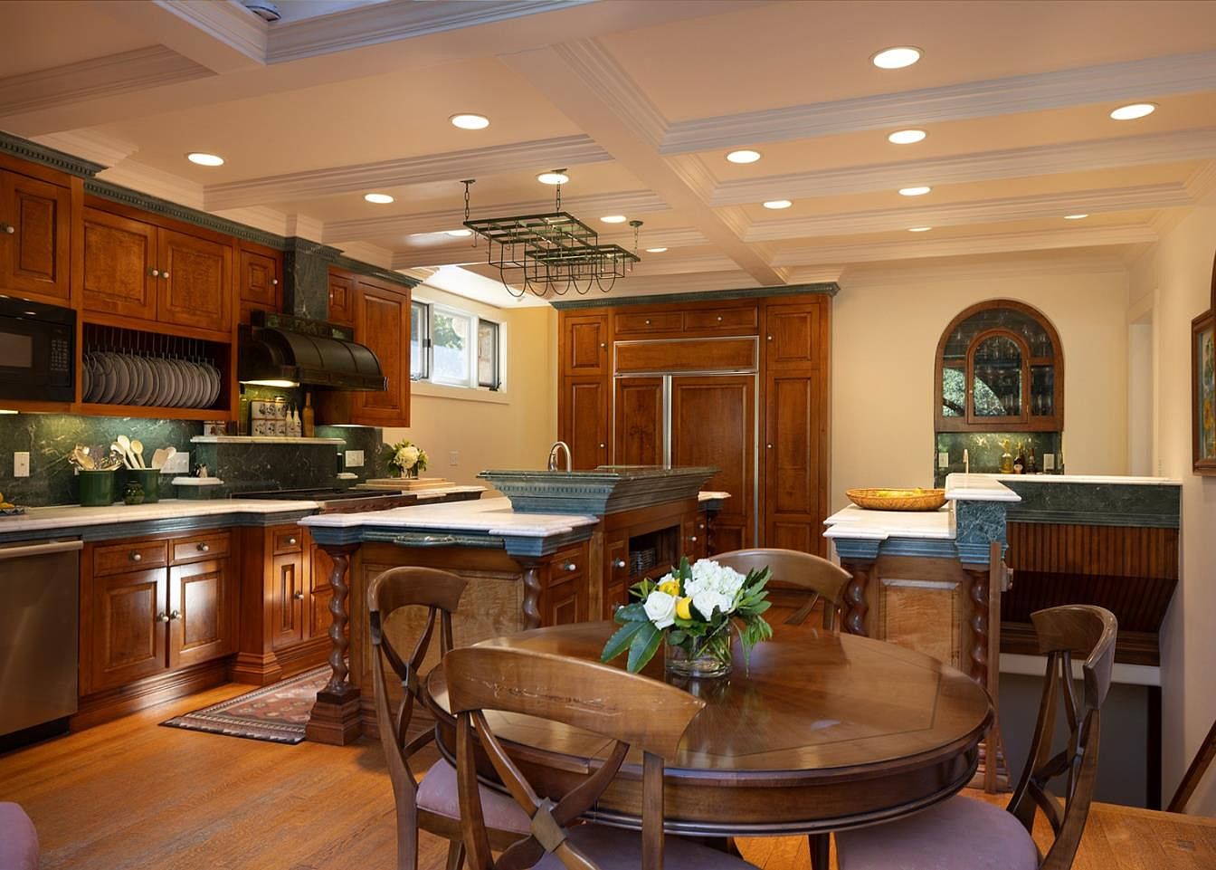 This beautifully crafted kitchen combines elegance and functionality, featuring rich wooden cabinetry that provides ample storage. The spacious layout includes a central island topped with stunning granite, perfect for meal prep or informal dining. A harmonious color scheme of warm browns and soft greens contributes to a cozy atmosphere, enhanced by recessed lighting that brightens the space. Family-friendly elements such as an inviting round table encourage togetherness, while the stylish archway leads to additional workspaces. Architectural details, like coffered ceilings, add character, making this kitchen both inviting and stylish, ideal for gatherings and culinary creativity.