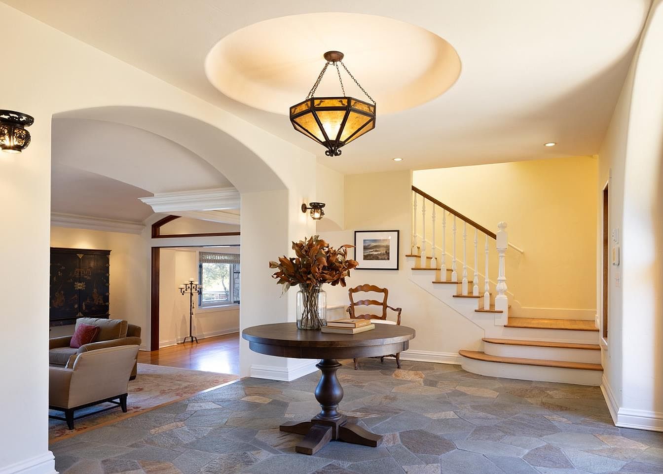 Entering this home reveals an inviting foyer, characterized by an elegant round table at its center, adorned with a simple yet striking vase of dried foliage. The rich, multi-toned slate flooring contrasts beautifully with the warm, creamy walls, creating a welcoming ambiance. Natural light floods in from the adjacent room, illuminating decorative wall sconces that add soft lighting. An elegantly curved staircase leads to the upper levels, showcasing classic wooden railings. Architectural details such as arched doorways enhance the space’s character, while family-friendly features ensure it serves as a perfect gathering place for loved ones.