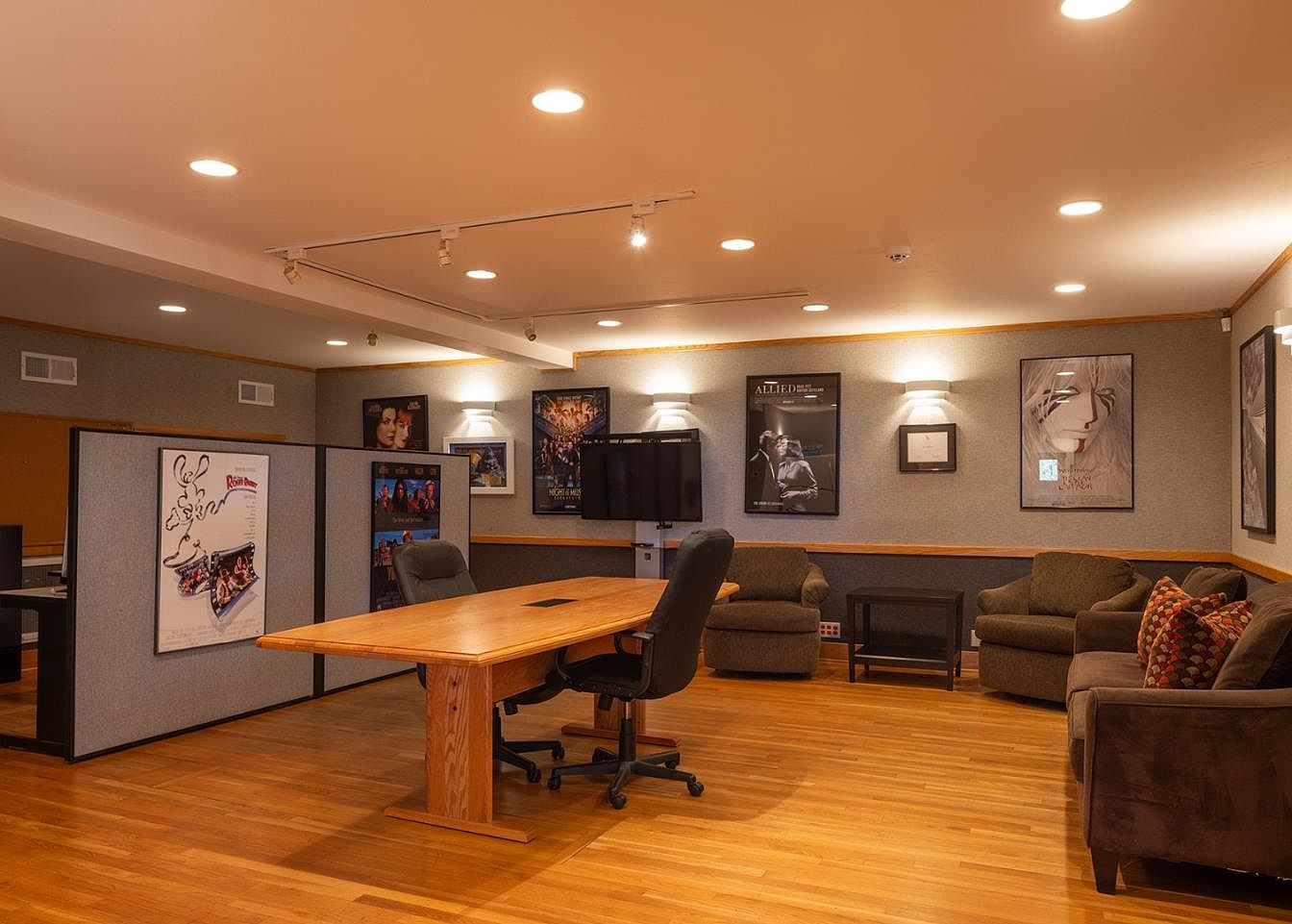 This inviting home office features a spacious layout perfect for productivity and relaxation. The central wooden table accommodates collaborative work, surrounded by comfortable ergonomic chairs. Warm oak flooring complements the earthy hues of the plush sofas, encouraging family gatherings or casual meetings. Artwork and movie posters adorn the walls, adding a touch of personality and creativity. Soft, recessed lighting and wall sconces illuminate the space, creating an inviting atmosphere. A sleek entertainment unit houses modern technology, ensuring seamless integration for both work and leisure. This multifunctional area merges style with comfort, making it perfect for family bonding.