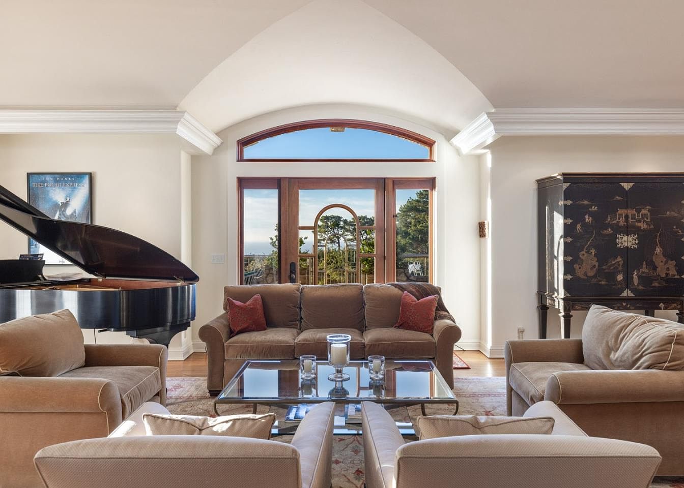 This elegant living room features a harmonious blend of comfort and sophistication. The oversized windows framed with an intricate arch allow natural light to flood the space, showcasing scenic outdoor views. A plush, beige sofa adorned with contrasting burgundy pillows invites relaxation, while stylish armchairs enhance the seating arrangement. A sleek glass coffee table sits atop a textured area rug, adding a layer of warmth. A grand piano occupies one corner, perfect for family gatherings and musical moments. Architectural details, including crown molding and hardwood floors, elevate the aesthetic, making this space ideal for both casual family time and entertaining guests.