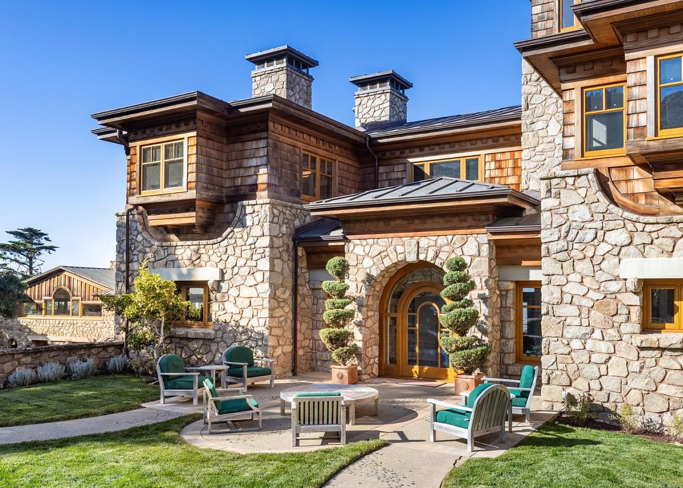 This charming outdoor living area features a harmonious blend of natural stone and wood architecture, creating an inviting atmosphere. Elegant stone walls are complemented by a roof with a sleek metal finish, while large rounded windows enhance the charm and invite natural light. Cozy seating arrangements with plush green cushions are strategically placed around a circular stone fire pit, perfect for family gatherings. Lush greenery surrounds the space, adding vibrancy and tranquility to the scene. The thoughtful layout encourages relaxation and outdoor enjoyment, making it an ideal retreat for both family and entertaining guests.