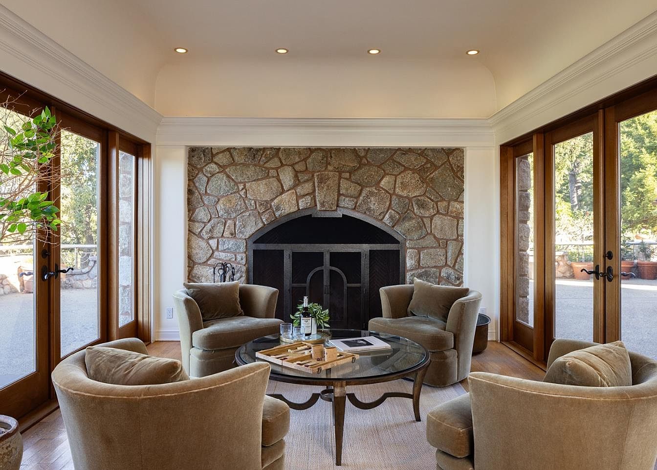 This inviting living room features a seamless blend of comfort and elegance. The focal point is a stunning stone fireplace, intricately designed with natural textures, providing warmth and a rustic charm. Soft, plush seating in muted earth tones surrounds a round glass coffee table, enhancing the space’s open feel. Large windows allow natural light to flood the room, connecting indoor comfort with the outdoor scenery. The warm wooden flooring adds a touch of sophistication, while green plants introduce a refreshing vibrancy. Thoughtful architectural details, including decorative molding, elevate the overall aesthetic, making it a perfect gathering spot for family and friends.