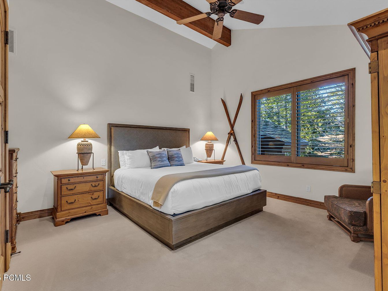 This master bedroom exudes warmth and comfort with its soft, neutral color palette and rich wooden accents. The spacious layout features a plush king-sized bed centered beneath a high ceiling, accented by exposed wooden beams that enhance the rustic charm. A cozy seating area invites relaxation, highlighted by a tasteful armchair. The elegant nightstands, topped with warm-lit lamps, offer both functionality and style. Natural light floods the room through stylishly crafted window shutters, providing privacy while showcasing views of the serene outdoors. The overall design is perfect for creating a family-friendly haven infused with tranquility.