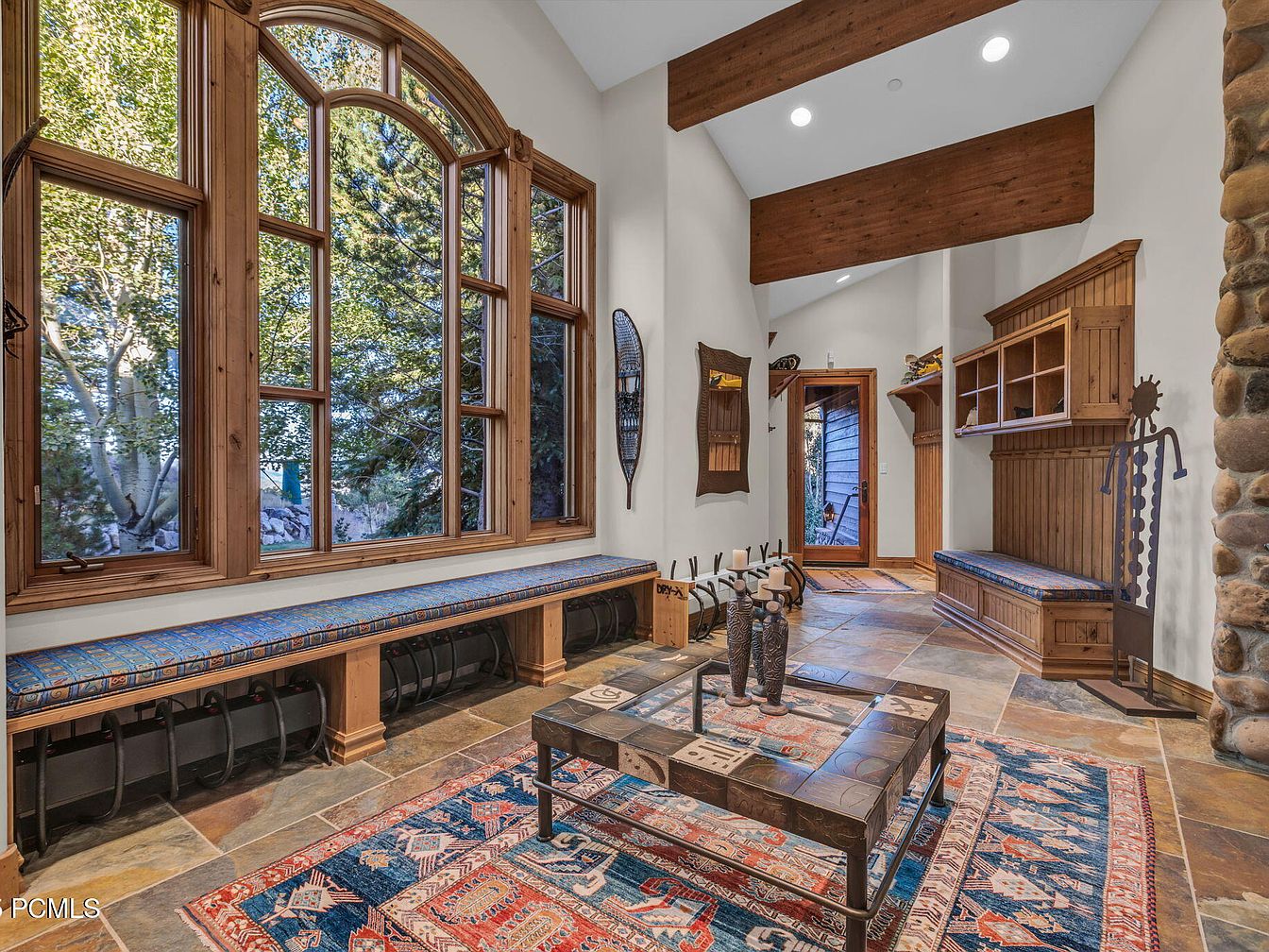 This spacious entryway welcomes visitors with high ceilings and ample natural light, showcased by expansive arched windows framed in rich wood. The stone and slate flooring adds an earthy touch, while the warm wooden beams overhead create an inviting atmosphere. A custom-built bench runs along one wall, adorned with patterned fabric, perfect for family gatherings and a cozy ambiance. Decorative details include unique wall art and a stylish mirror that enhances the openness of the space. The thoughtfully designed entryway combines functionality with aesthetics, making it an optimal start to a home full of character.