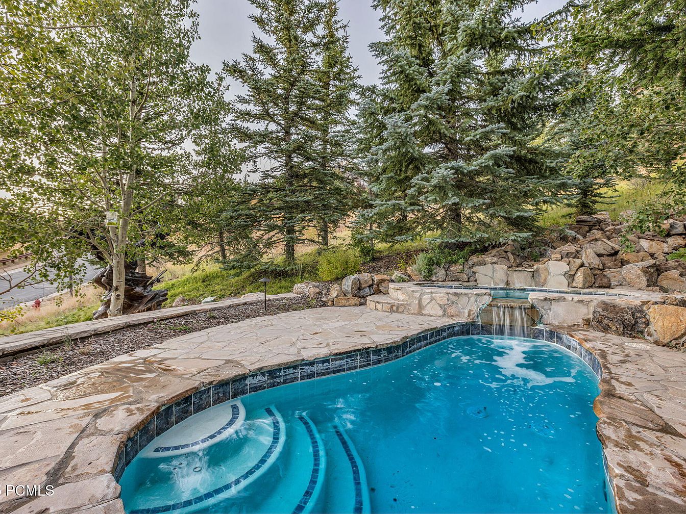 A serene backyard oasis invites relaxation and outdoor enjoyment. The stunning hot tub, featuring a curved design and tiled accents, offers a perfect retreat for unwinding. Surrounded by lush greenery, including majestic aspens and evergreen trees, this space harmonizes with nature. Stone pathways connect the areas, enhancing the natural aesthetic while ensuring safety. A gentle waterfall cascades from the spa, providing a soothing soundtrack to outdoor gatherings. The warm tones of the stonework complement the tranquil blue of the water, creating a cohesive color palette. Perfect for families, this inviting space enhances outdoor living with its beautiful landscape.