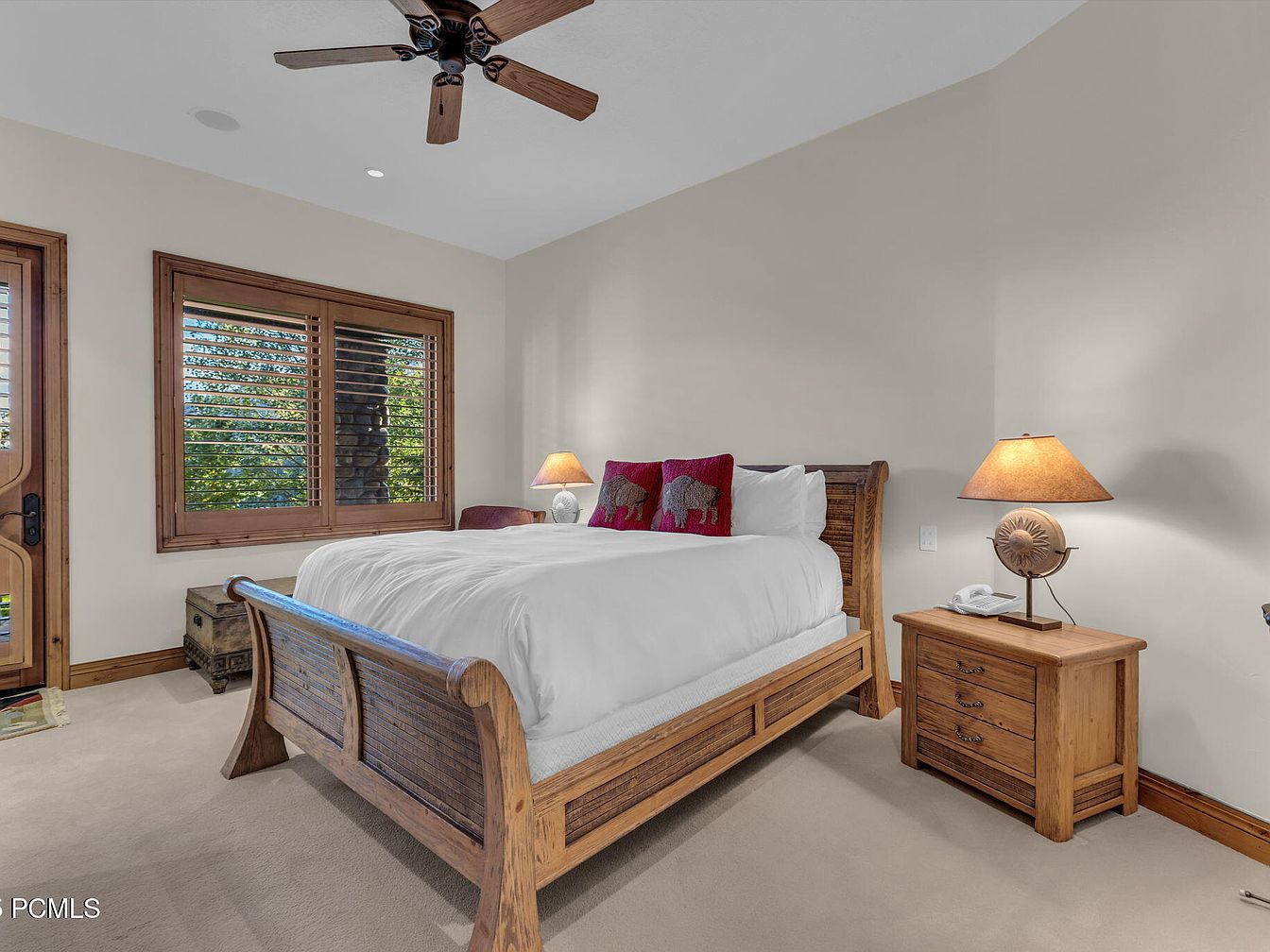A tranquil master bedroom featuring a luxurious wooden sleigh bed dressed in crisp white linens and vibrant elephant-themed pillows. Natural light floods the room through beautifully framed windows adorned with shutters, creating an inviting atmosphere. The muted beige walls complement the warm, rich tones of the wooden furniture, including the nightstand and bedside lamp that adds a soft glow. A plush carpet underfoot ensures comfort, while the ceiling fan provides a refreshing breeze. The rustic decor and thoughtful layout foster a cozy and family-friendly space, perfect for relaxation and rejuvenation.