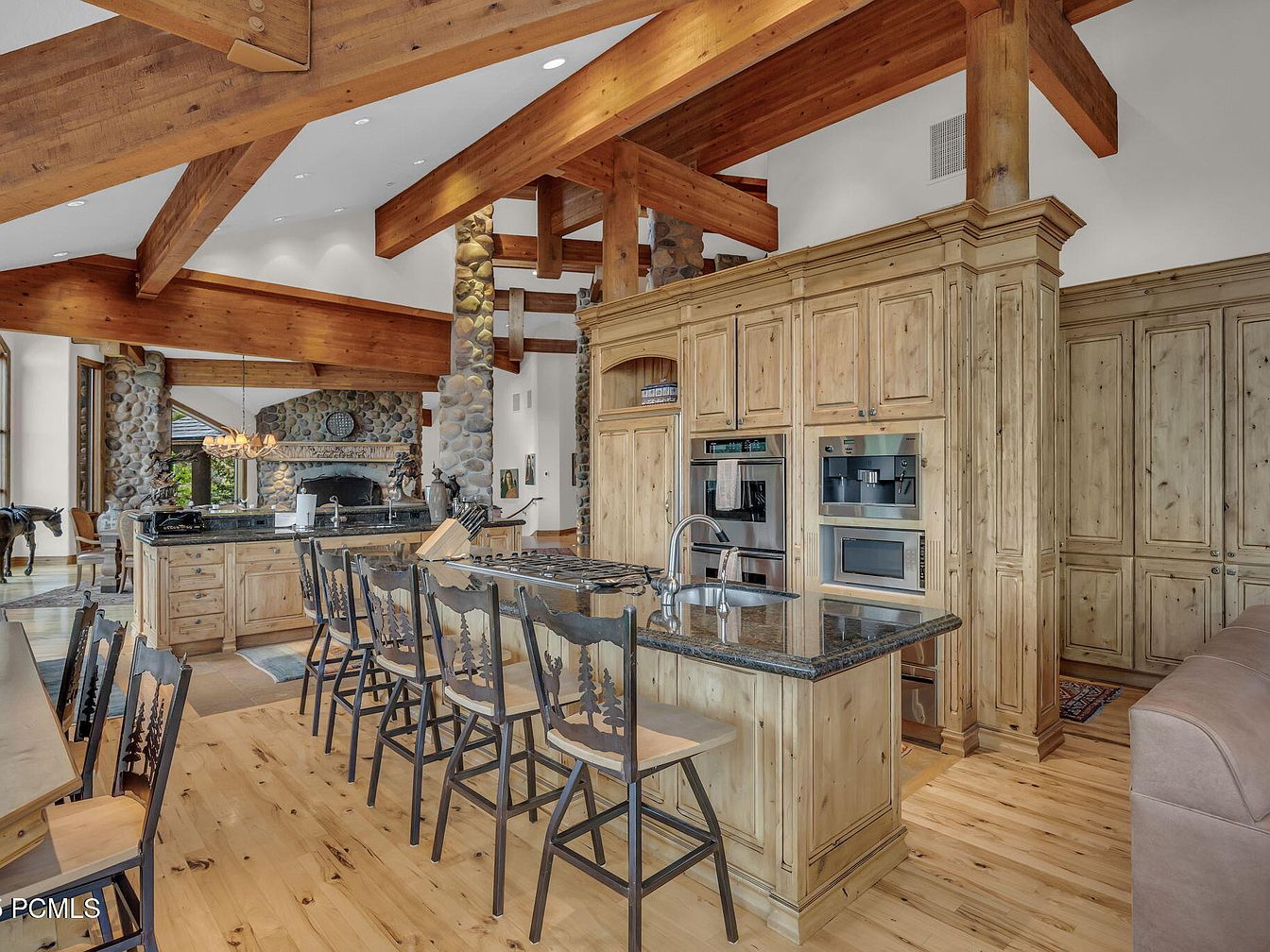 This gourmet kitchen seamlessly blends rustic charm with modern functionality. Exposed wooden beams and soaring ceilings create an open feel, accentuating the natural light pouring in through large windows. The centerpiece is a substantial island with a dark granite countertop, surrounded by ample seating for family gatherings. Light wooden cabinetry adds warmth and complements the natural pine floors. High-end appliances are integrated seamlessly for a sleek look, while stone accents enhance the inviting atmosphere. Thoughtfully arranged, it’s perfect for both casual family meals and grand entertaining, making it a delightful heart of the home.