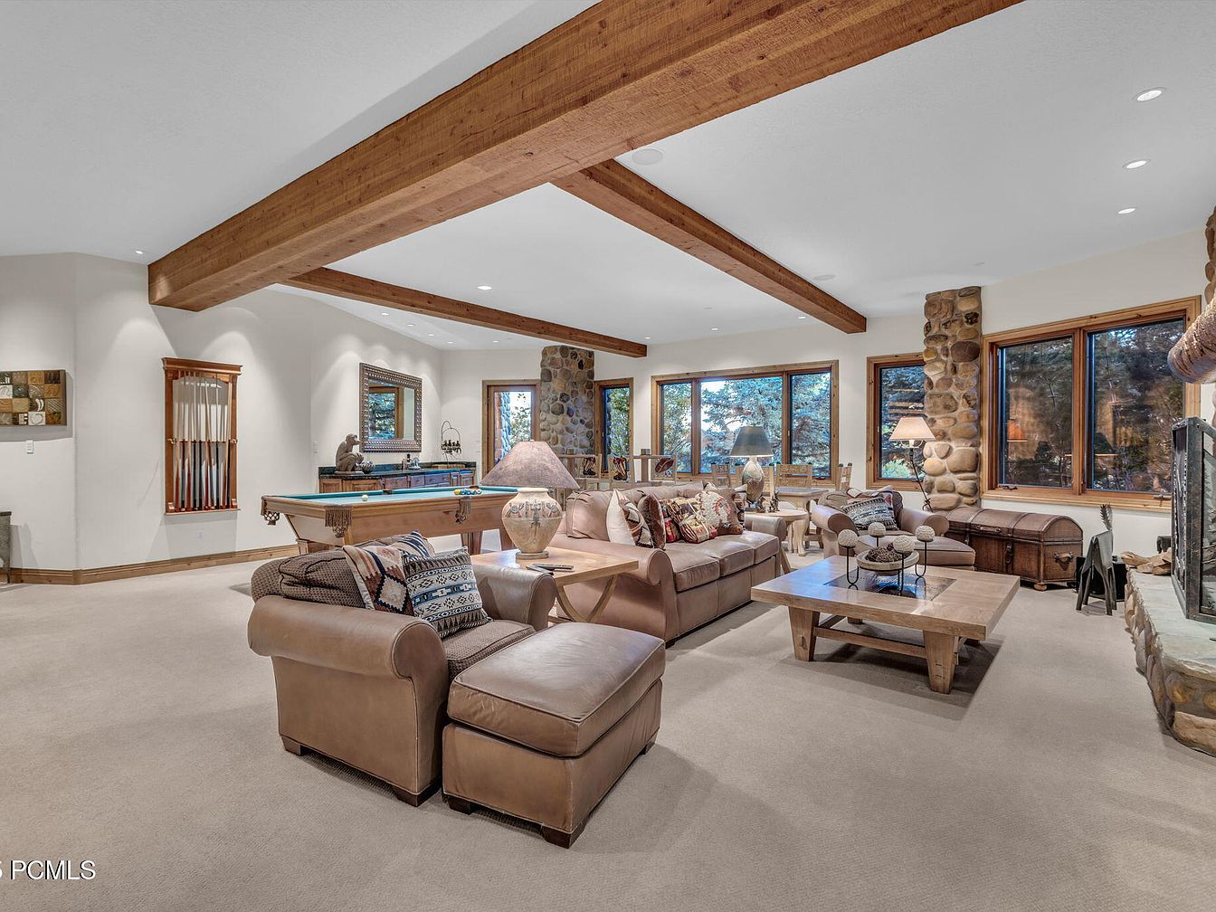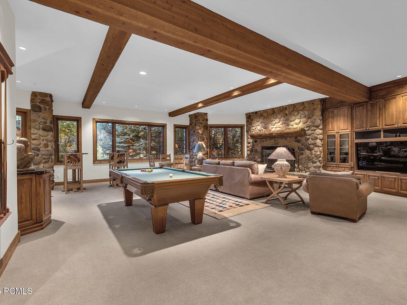 This spacious game room seamlessly blends comfort and elegance, featuring a classic billiards table as the central focus. The warm, earthy tones of the wooden beams and stone walls create an inviting atmosphere, perfect for family gatherings. Expansive windows illuminate the space, offering breathtaking views of the surrounding nature. Plush leather sofas encourage relaxation, while the carefully curated decorative elements, like the patterned area rug and stylish table lamps, add charm. An entertainment center discreetly integrates modern convenience with rustic appeal, making this room a perfect retreat for both leisure and family bonding.
