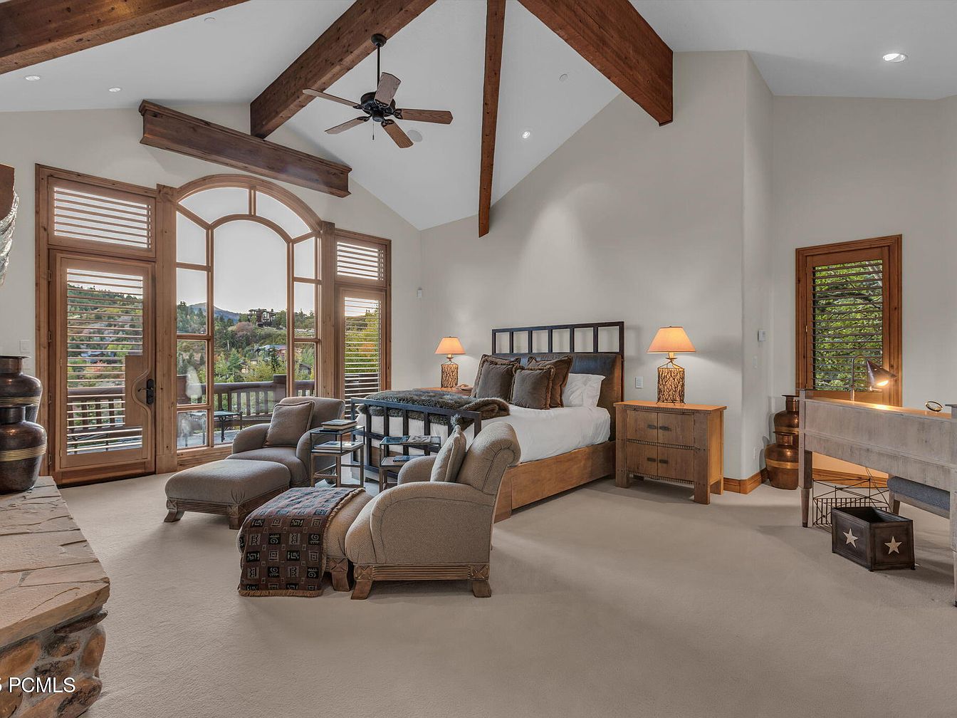 This serene master bedroom features a spacious layout highlighted by soaring vaulted ceilings with exposed wooden beams. Large, elegantly designed windows frame picturesque mountain views, inviting natural light and creating a welcoming atmosphere. The restful color palette combines soft neutrals with earthy tones, promoting tranquility. A plush king-sized bed, adorned with rich brown and gold linens, offers an inviting focal point, while stylish side tables with lamps provide warm, ambient lighting. Cozy seating on a luxurious armchair and ottoman creates an ideal reading nook. Thoughtful architectural details and family-friendly features add a cozy touch, perfect for relaxation.