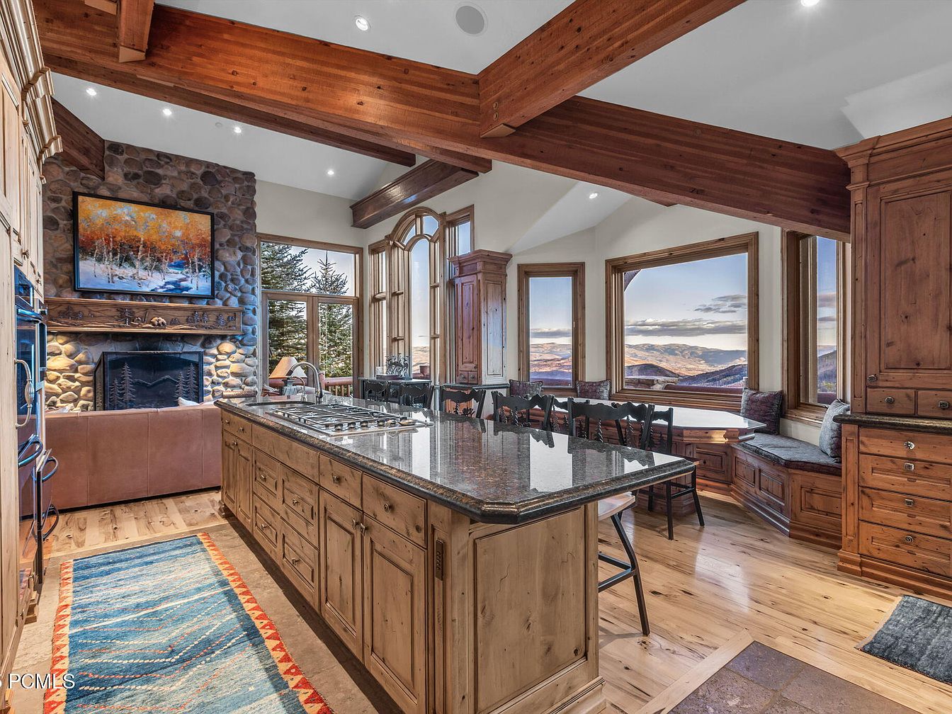 This inviting kitchen features a spacious layout designed for both cooking and gathering, showcasing a large central island with a granite countertop that invites family interaction. The rich wooden cabinets exude warmth, complemented by the stone-based fireplace, which adds a cozy, rustic touch. Expansive windows frame breathtaking mountain views, flooding the space with natural light and connecting indoor and outdoor living. A breakfast nook with built-in seating provides a perfect family-friendly area for casual meals. A vibrant area rug adds color underfoot, enhancing the overall aesthetic while ensuring comfort and functionality in a harmonious environment.
