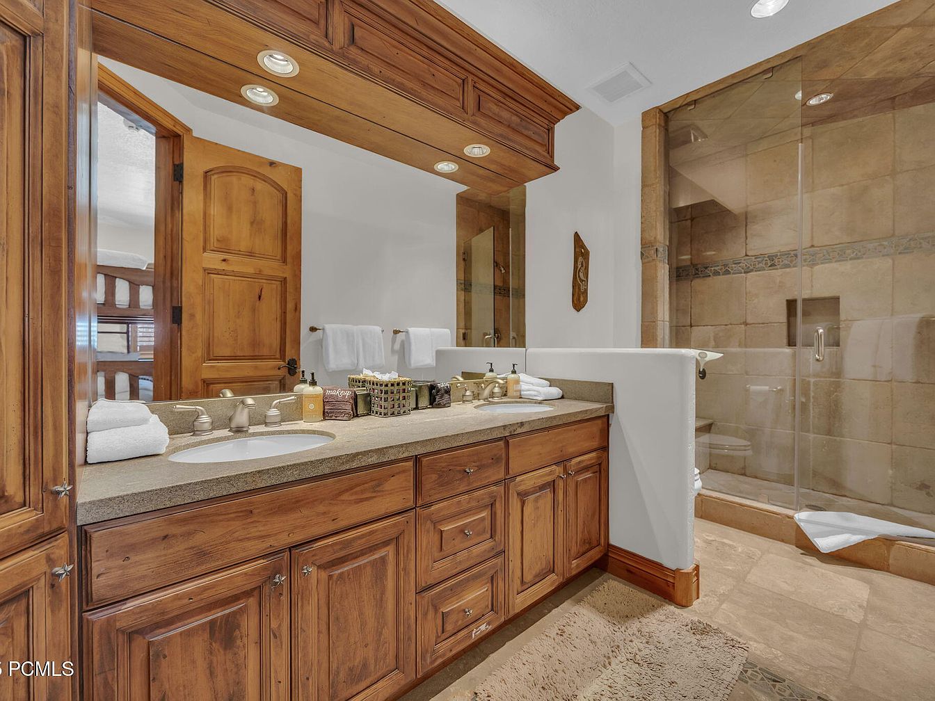 This inviting bathroom showcases a perfect blend of rustic charm and modern luxury. The rich, wooden cabinetry offers ample storage while exuding warmth and character. A spacious double vanity featuring a smooth countertop complements the elegant fixtures for a stylish touch. The neutral color palette, highlighted by soft beige tiles, creates a serene atmosphere, perfect for relaxation. A walk-in shower with glass doors adds to the openness, while plush towels and thoughtful details, such as decorative baskets, enhance functionality. The layout is both practical and family-friendly, making this a wonderful retreat for everyone in the home.