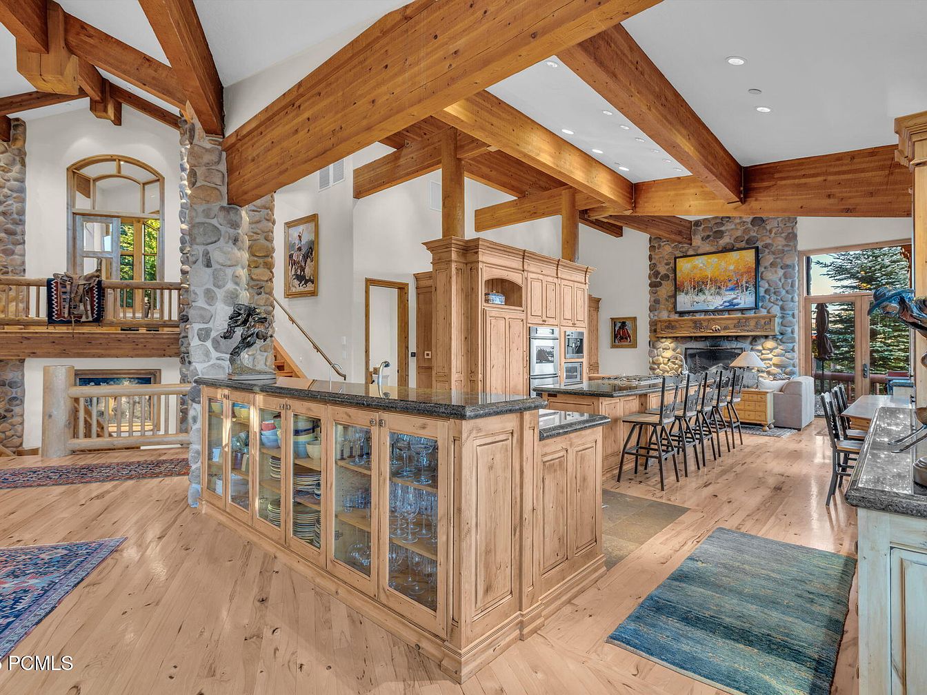 This spacious open kitchen boasts soaring ceilings with exposed wooden beams, creating an inviting atmosphere. The central island features natural stone and wood, complemented by glass-front cabinetry, showcasing beautiful dishware. A warm color palette blends honey-toned wood with earthy stone accents around the fireplace, enhancing the rustic charm. Modern appliances provide functionality while seamlessly integrating with classic craftsmanship. Family-friendly features include ample seating at a long wooden dining table and bar stools, perfect for gatherings. Natural light floods in through large windows, connecting this heart of the home with the outdoors, inviting comfort and warmth into every moment.