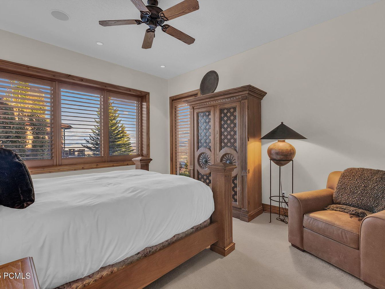 This master bedroom exudes warmth and comfort, featuring rich wood elements that enhance its cozy ambiance. The spacious layout accommodates a luxurious bed draped in soft linens, complemented by plush pillows. Large windows with slatted shutters invite natural light while framing scenic views of nature outside. A beautifully crafted wooden armoire stands as a focal point, showcasing intricate design details. The color scheme balances neutral tones with earthy textures, creating an inviting atmosphere. An elegant reading nook is adorned with a stylish armchair, perfect for relaxation. Thoughtfully designed for family living, this room offers a serene escape.