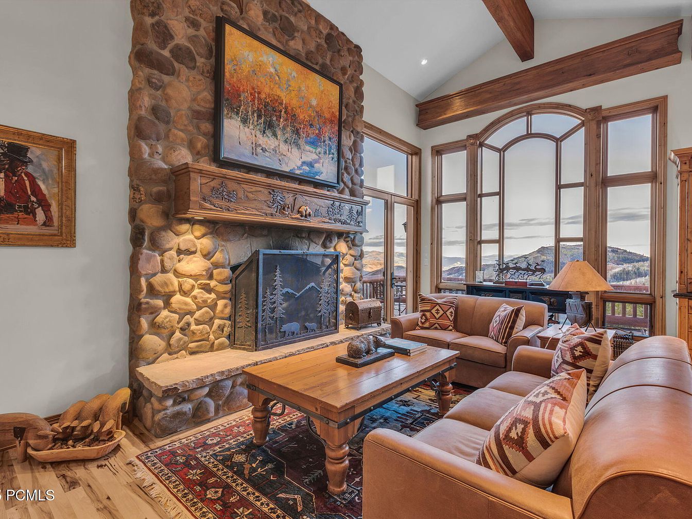 This inviting living room features a stunning stone fireplace as a central focus, accentuated by a beautifully carved wooden mantel. The large windows ensure the space is bathed in natural light, offering breathtaking mountain views. The seating area is arranged around a rustic wooden coffee table, adorned with carefully selected decor pieces. Rich, warm tones dominate the color scheme, complemented by plush, patterned cushions that add texture. The hardwood floors enhance the cozy atmosphere, while art pieces, including a framed portrait, enhance the room’s character. Ideal for family gatherings, this space strikes a perfect balance between elegance and comfort.
