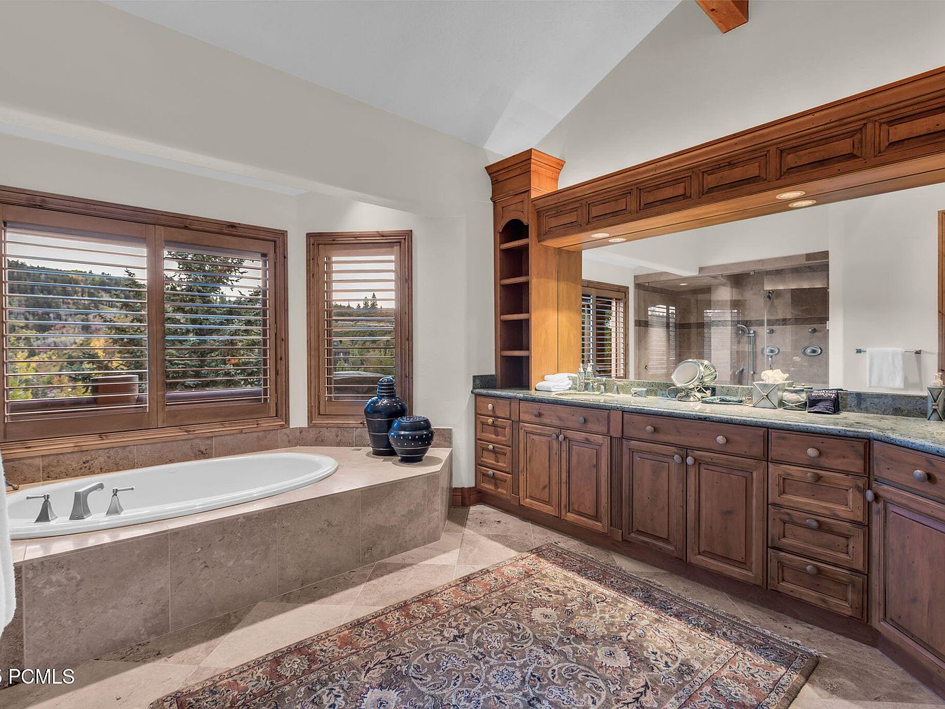 This bathroom embodies elegance and tranquility, featuring a spacious layout adorned with rich wooden cabinetry and a seamless granite countertop. A sunken tub provides a perfect spot for relaxation, illuminated by natural light from strategically placed windows that offer stunning views. Classic shutters add charm while maintaining privacy. The combination of beige marble flooring and intricate area rugs enhances warmth and visual interest. Thoughtfully designed storage solutions ensure a clutter-free environment, making it ideal for families. Architectural details like vaulted ceilings and stylish lighting fixtures harmonize functionality with luxury, creating an inviting sanctuary for rejuvenation.
