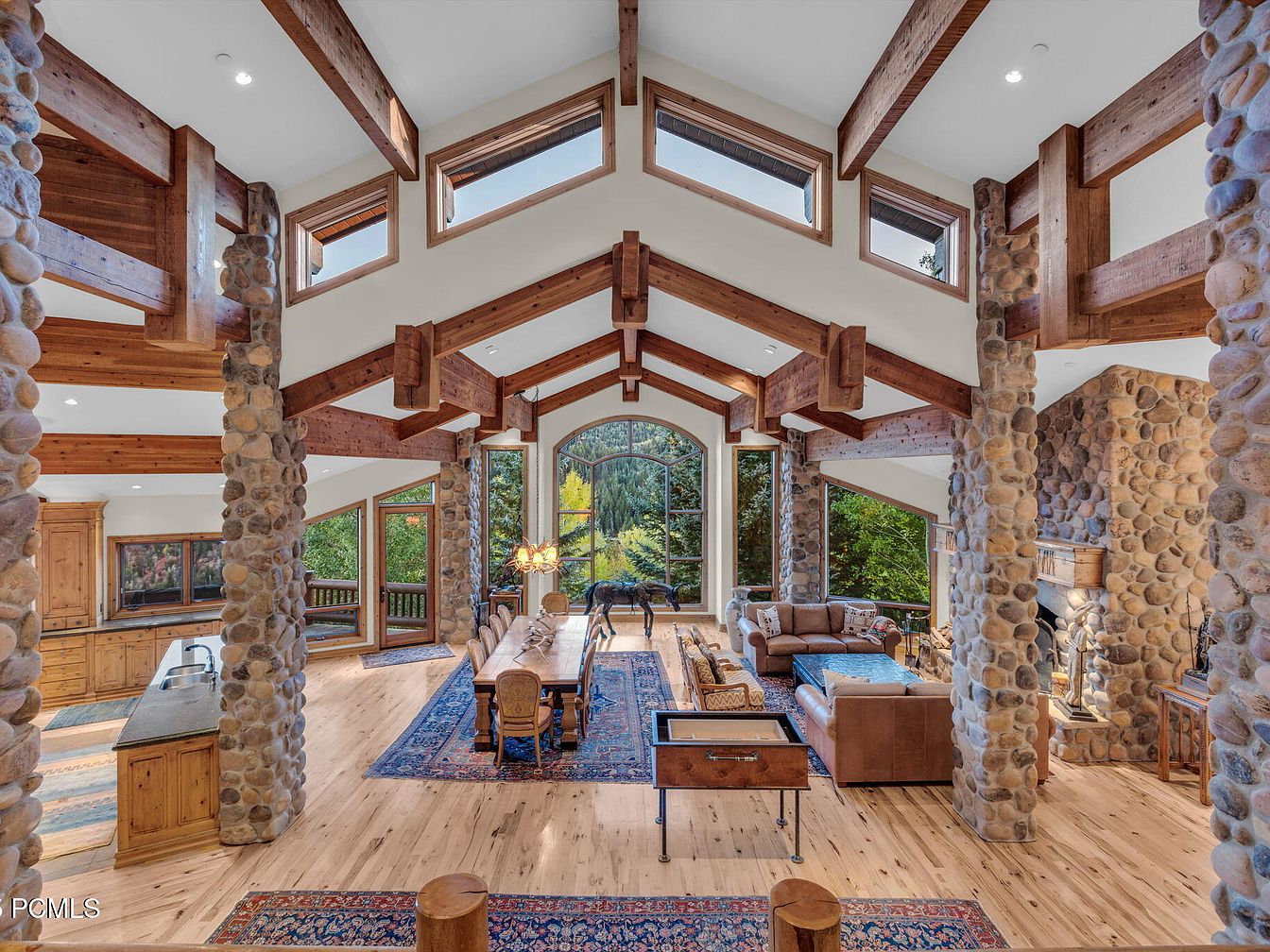 An expansive living area boasts a breathtaking open layout, with soaring vaulted ceilings supported by rustic wooden beams. Natural stone pillars add a warm, inviting touch, while large windows frame stunning outdoor views, inviting nature inside. The space is adorned with a rich color palette of earthy tones, complemented by plush furniture that encourages relaxation and family gatherings. A beautifully patterned area rug adds a layer of coziness beneath the elegant dining set. This family-friendly design seamlessly blends comfort with style, offering ample space for socializing and cozy evenings by the stone fireplace.