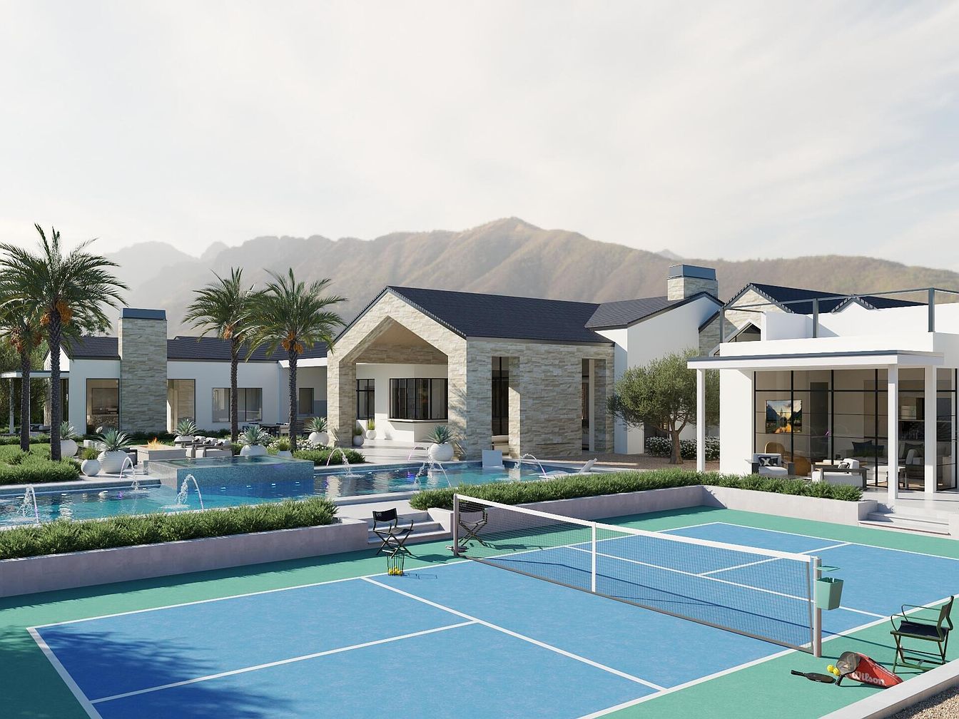 Showcasing a stunning outdoor lifestyle, this residence features an expansive backyard with a luxurious pool, bordered by vibrant landscaping and palm trees. The contemporary architecture combines smooth lines with natural stone elements, establishing a harmonious balance with the surroundings. Adjacent to the pool, a well-maintained tennis court offers an inviting space for family activities, promoting an active lifestyle. Large glass windows in the home invite abundant natural light, enhancing the spacious feel inside. The color palette incorporates earth tones and whites, creating a serene environment that feels welcoming and ideal for both relaxation and entertaining.