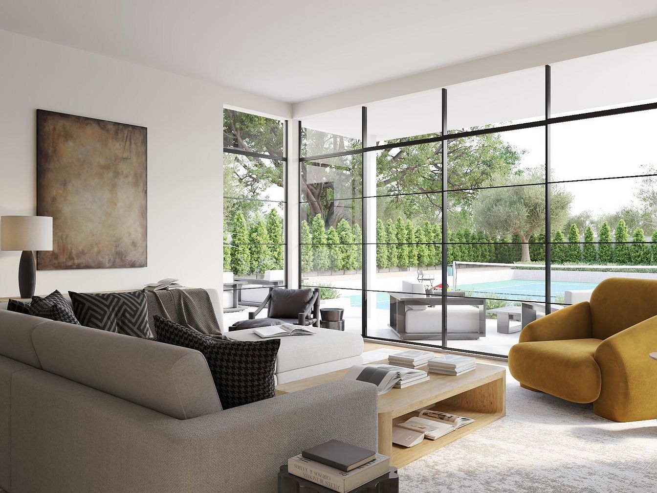 This modern living room captures a perfect blend of comfort and style. The open layout features large floor-to-ceiling windows that invite natural light, creating a bright and airy atmosphere. A cozy grey sofa adorned with patterned pillows is paired with a distinctive mustard armchair, adding a splash of color. The minimalist wooden coffee table complements the neutral color palette, enhancing the inviting feel. Architectural details like sleek lines and a soft area rug provide a harmonious backdrop to family gatherings. Outside, a serene view of the pool and lush greenery extends the living space, promoting a tranquil lifestyle.