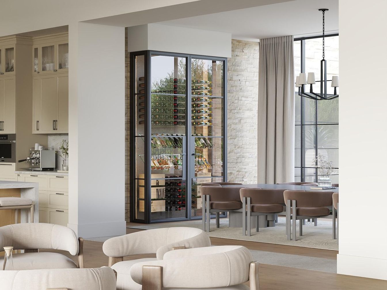 This elegant dining area showcases a seamless blend of contemporary design and functionality. An open floor plan connects the stylish kitchen with a wine display, featuring an impressive glass-fronted wine cooler that adds sophistication. The warm, muted color palette enhances the welcoming atmosphere, while plush, taupe dining chairs surround a modern circular table, perfect for family gatherings. Large windows draped with soft, light gray curtains allow ample natural light, creating an airy feel. Architectural details like the textured stone wall provide visual interest, complemented by minimalist light fixtures that add a touch of elegance to the space.