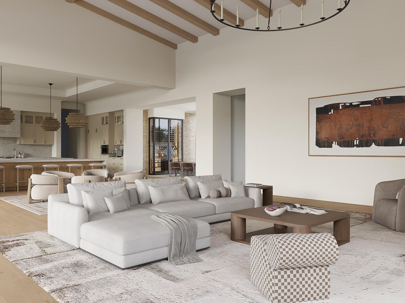 This open-concept living area showcases a blend of modern elegance and family-friendly comfort. The high ceilings are accentuated by exposed wooden beams, imparting a warm, rustic charm. A plush, L-shaped sectional invites relaxation, complemented by a chic, textured area rug that adds visual interest. Natural light floods the space through expansive windows, enhancing the soft neutral color palette of cream and beige tones. The adjacent kitchen features streamlined cabinetry and stylish pendant lighting, ensuring a seamless flow for family gatherings. Thoughtfully designed furniture, including a unique patterned pouf, further enhances functionality while maintaining a sophisticated aesthetic.