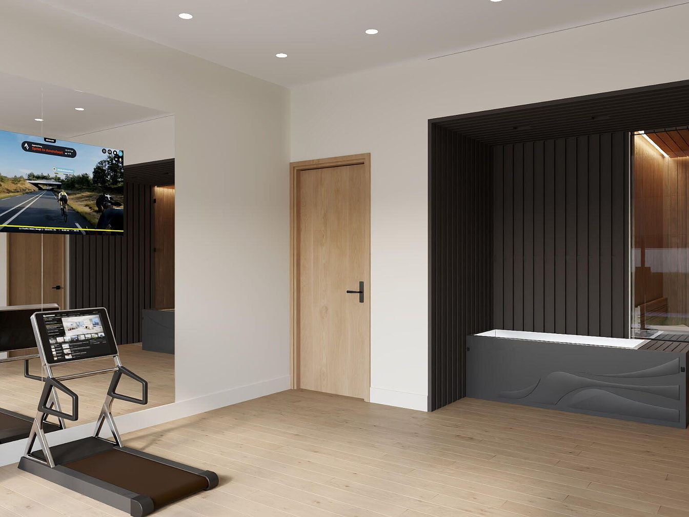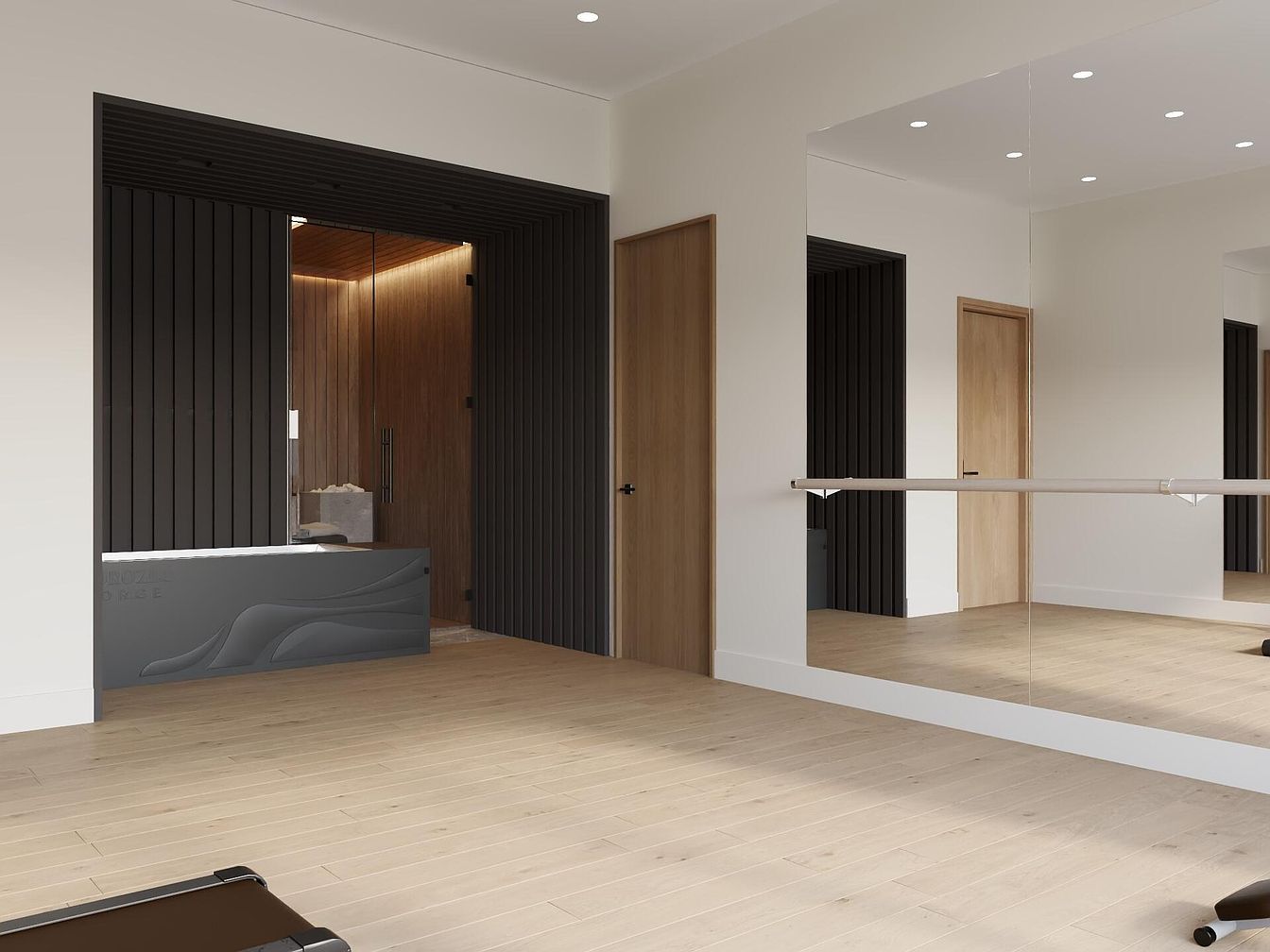 This modern home gym space showcases a seamless blend of functionality and style. The open layout features a warm wooden floor that invites activity, while the minimalistic design promotes a serene and focused environment. A prominent barre along the mirrored wall encourages fitness enthusiasts to engage in various exercises. The sleek black entrance to the sauna adds a touch of sophistication, contrasting beautifully with the light neutral walls. Soft, ambient lighting enhances the overall mood, ensuring ample illumination for workouts. Thoughtfully placed storage keeps the space tidy, making it ideal for family use and personal fitness journeys.
