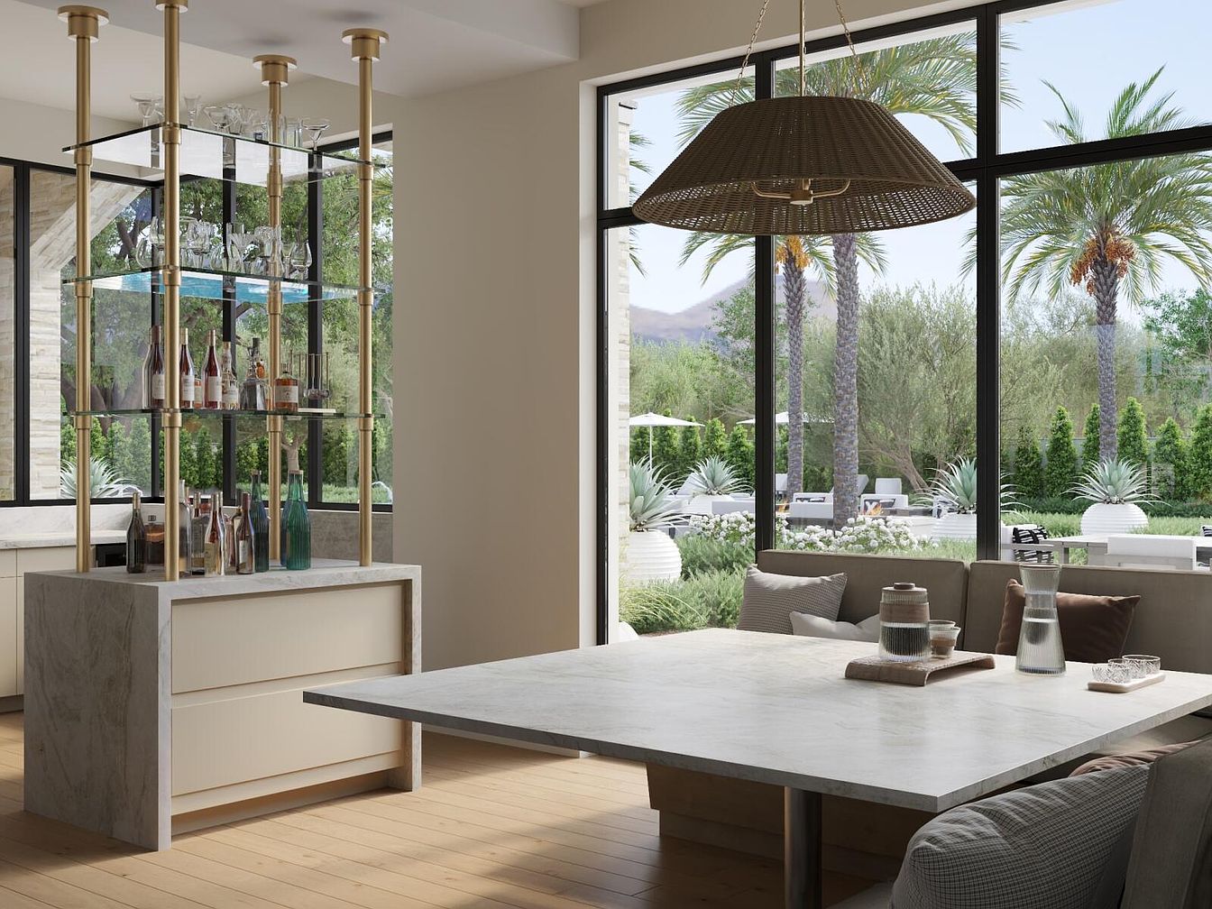 This inviting dining area blends modern design with a warm, welcoming atmosphere. The centerpiece is a sleek marble table, perfect for family gatherings, complemented by comfortable, plush seating. A stylish bar stand, featuring transparent shelving and elegant lighting, showcases a selection of beverages and enhances the space’s sophistication. Floor-to-ceiling windows offer a breathtaking view of the lush outdoor landscape, seamlessly connecting indoor and outdoor living. The neutral color palette of creams and soft browns creates a soothing ambiance, while natural wood flooring adds warmth. Thoughtful design elements like the woven pendant light and fresh greenery enrich the overall aesthetic.