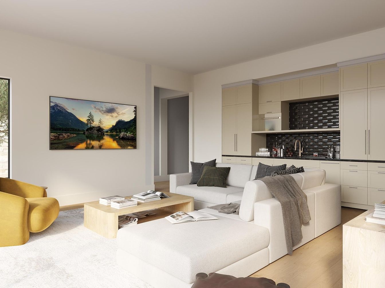 This inviting living room combines modern elegance with a warm, family-friendly atmosphere. The spacious area features a sleek sectional sofa adorned with textured throw blankets and decorative pillows, creating a cozy setting for gatherings. A light wood coffee table complements the soft, neutral color palette of cream walls and light oak flooring, enhancing the airy feel. The vibrant yellow accent chair adds a pop of color, while the striking artwork above the couch draws attention. The open kitchen area, with its chic cabinetry and glossy black backsplash, seamlessly integrates into the living space, ideal for both relaxation and entertaining.
