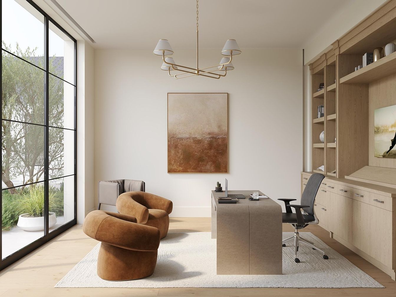 This home office blends functionality with modern aesthetics. Large windows invite natural light, framing views of lush greenery outside, while maintaining a serene atmosphere. A spacious, minimalist desk sits elegantly in the center, complemented by a sleek, ergonomic chair and a cozy, curved accent chair for relaxation. The warm color palette, featuring soft browns and neutral tones, enhances the inviting ambiance. Architectural elements, such as the golden chandelier and built-in shelving, harmonize with the contemporary design, showcasing curated decor. This space is perfect for productivity and comfort, making it ideal for both work and leisure.