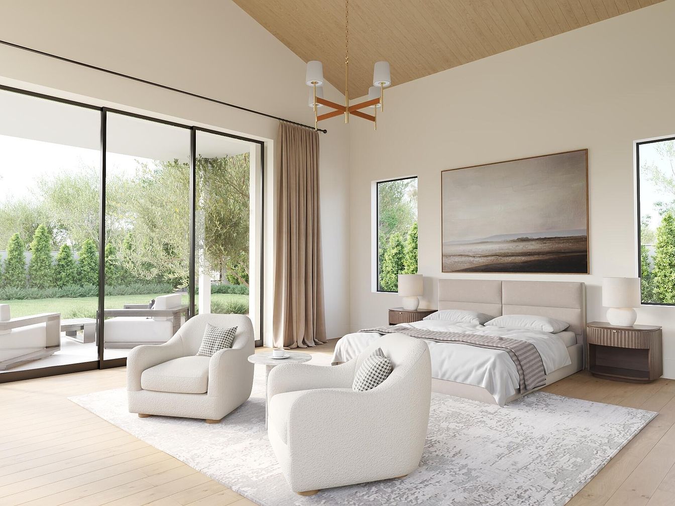 This spacious master bedroom emanates tranquility and modern elegance, featuring a vaulted wooden ceiling that enhances the open layout. Large floor-to-ceiling windows invite natural light and provide a seamless connection to the outdoors, where greenery beckons. The soft, neutral color palette creates a calming atmosphere, complemented by plush beige bedding and contemporary light fixtures. Two inviting, oversized chairs with textured upholstery create a cozy nook for relaxation, while sleek nightstands with understated decor offer convenience. The luxurious area rug adds warmth and sophistication, making this space perfect for restful nights and peaceful mornings.