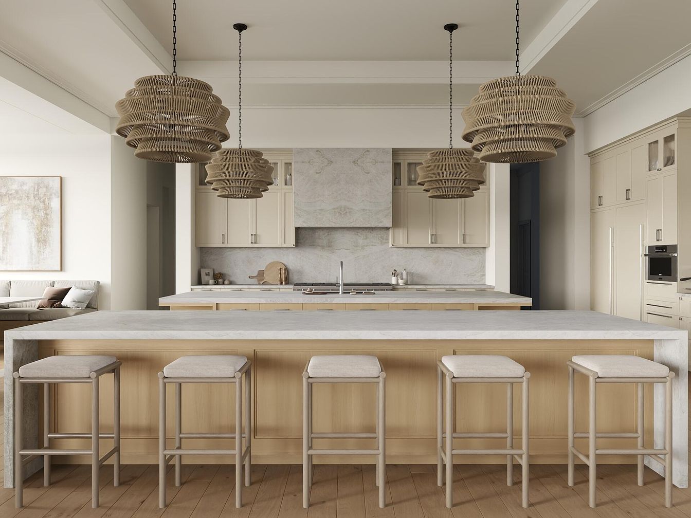 This contemporary kitchen showcases an inviting layout, highlighted by an expansive island that serves as both a prep area and casual dining space. Natural light floods through large windows, enhancing the calming neutral palette of cream and pale wood. Elegant, woven pendant lights hang above the island, adding a touch of warmth. Sleek cabinets perfectly blend function and style, featuring minimalist handles that emphasize clean lines. Comfortable bar stools, with soft upholstery, create a family-friendly atmosphere. The stunning marble backsplash introduces a subtle sophistication, making this kitchen not only a culinary haven but also a striking focal point of the home.