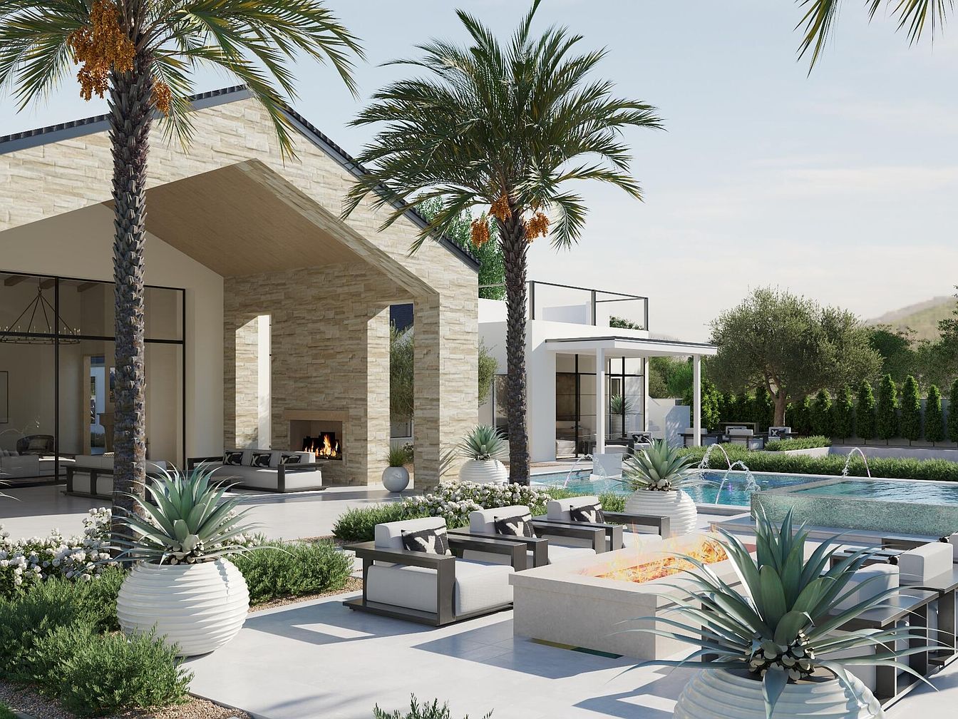 A stunning outdoor living area seamlessly blends modern architecture with nature. The spacious patio features a sleek stone fireplace, framed by expansive glass doors that invite natural light. Elegant seating arrangements in contemporary design surround lush greenery and striking planters, providing a tranquil escape. A shimmering swimming pool reflects the sun, enhanced by multiple water features for a soothing ambiance. Thoughtfully placed palm trees add a tropical flair, while the neutral color palette complements the earthy stonework and clean lines, creating a serene yet sophisticated atmosphere ideal for family gatherings or quiet relaxation.