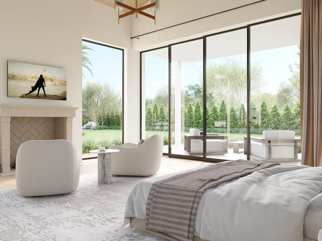 This master bedroom seamlessly blends comfort and elegance, featuring expansive glass doors that frame a picturesque view of a landscaped garden. The light, neutral color palette enhances the airy atmosphere, while soft textures in the bedding and plush area rug create a welcoming vibe. A modern fireplace with a herringbone pattern adds a touch of sophistication, contrasting beautifully with the minimalist furniture. Cozy accent chairs invite relaxation beside a chic side table, perfect for morning coffee or evening reads. This space is designed for family gatherings, offering both style and functionality, with natural light pouring in to invigorate the space.