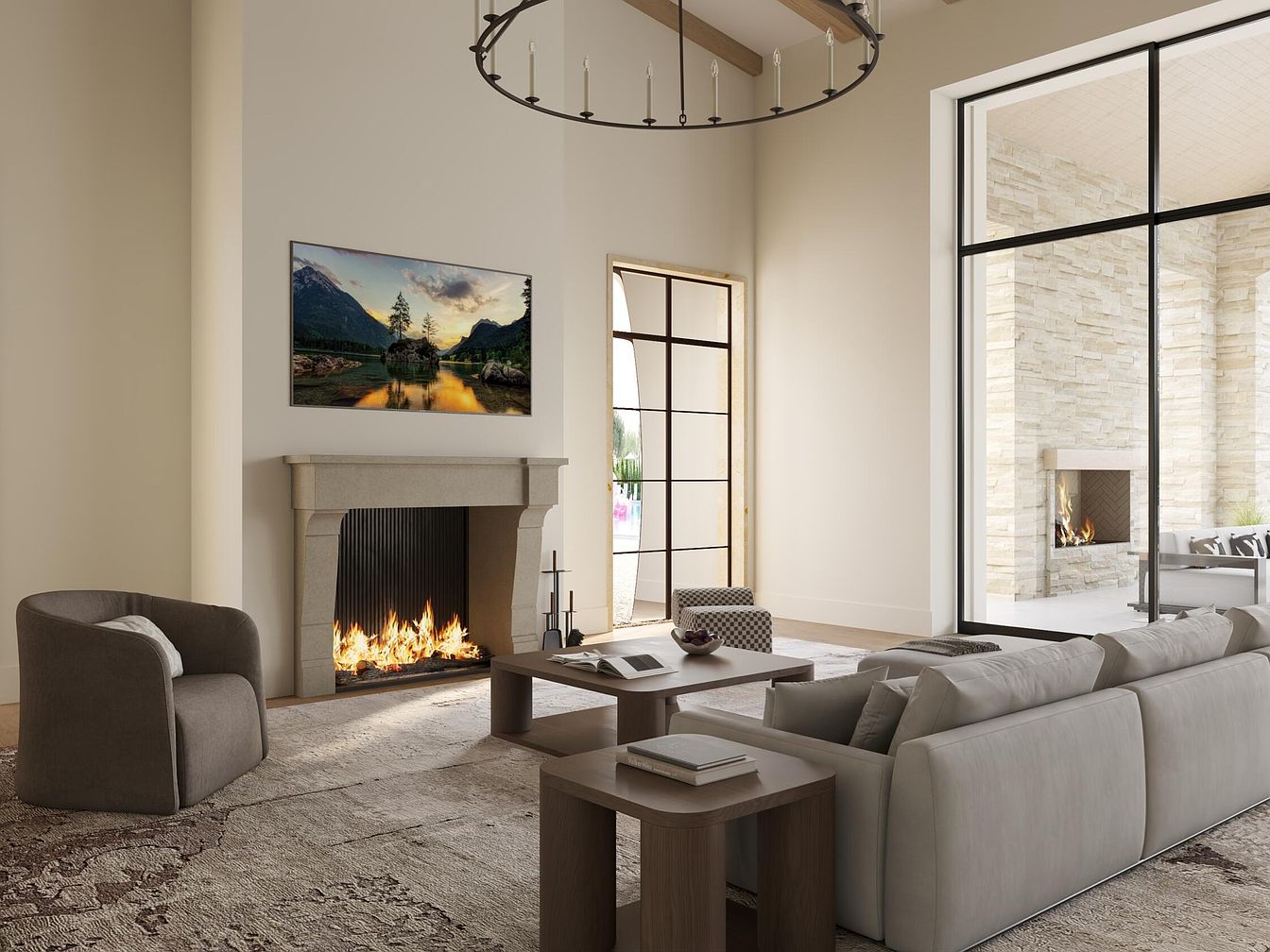 This inviting living room combines modern elegance with cozy comfort. A prominent stone fireplace serves as the focal point, offering warmth alongside large windows that flood the space with natural light. The neutral color palette, featuring soft creams and grays, enhances the serene atmosphere. A plush sectional sofa invites relaxation, paired with a unique accent chair that adds texture. Beneath, an intricately patterned area rug grounds the space. The minimalist coffee table complements the streamlined design, while exposed wooden beams add architectural interest. This family-friendly layout creates an ideal gathering place for relaxation and connection.