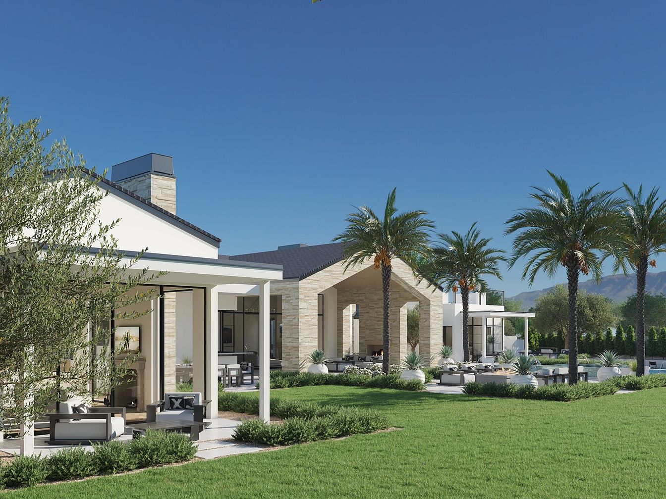 This stunning outdoor patio features a harmonious blend of modern and natural elements. Spacious and open, the design incorporates sleek furniture with comfortable seating arrangements, perfect for family gatherings. The color palette consists of neutral tones complemented by green landscaping, creating an inviting atmosphere. Tall palm trees frame the area, enhancing its resort-like feel. The architectural elements include elegant stone accents and a well-structured roof, providing shaded spaces to relax. With ample room for socializing and dining outdoors, this patio exemplifies functionality while offering a tranquil environment, ideal for enjoying the beauty of nature and outdoor living.