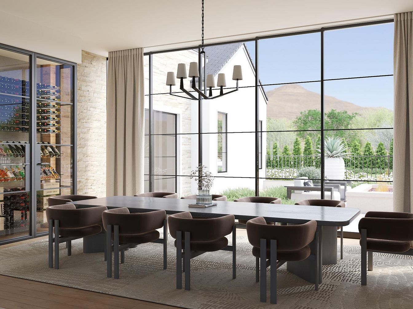 This dining room offers a seamless blend of modern sophistication and natural beauty. Bathed in light through expansive glass windows, it features a sleek, elongated table surrounded by plush, curved chairs that invite comfort during meals and gatherings. The neutral color palette of soft earth tones harmonizes with the light wood flooring and textured area rug, creating a warm atmosphere. Floor-to-ceiling drapes frame the windows, while a striking chandelier overhead adds an elegant touch. The adjacent wine display echoes the culinary passion of the space, making it a perfect family-friendly environment for dining and entertaining.