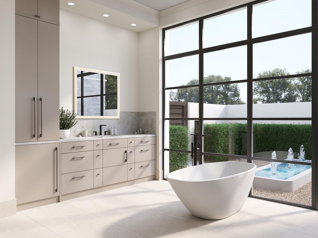 This elegant bathroom features a spacious layout accentuated by large windows that invite abundant natural light. The soothing color palette comprises soft beige cabinetry and natural stone elements, offering a serene atmosphere. A free-standing oval soaking tub serves as a stunning centerpiece, perfectly harmonizing with the minimalist design. Sleek fixtures and a spacious countertop enhance functionality while adding a modern touch. Family-friendly elements are evident in the easy-clean surfaces and strategic storage solutions. The view through expansive glass doors reveals a tranquil outdoor space, complete with manicured landscaping, creating a seamless connection between the indoor and outdoor environments.