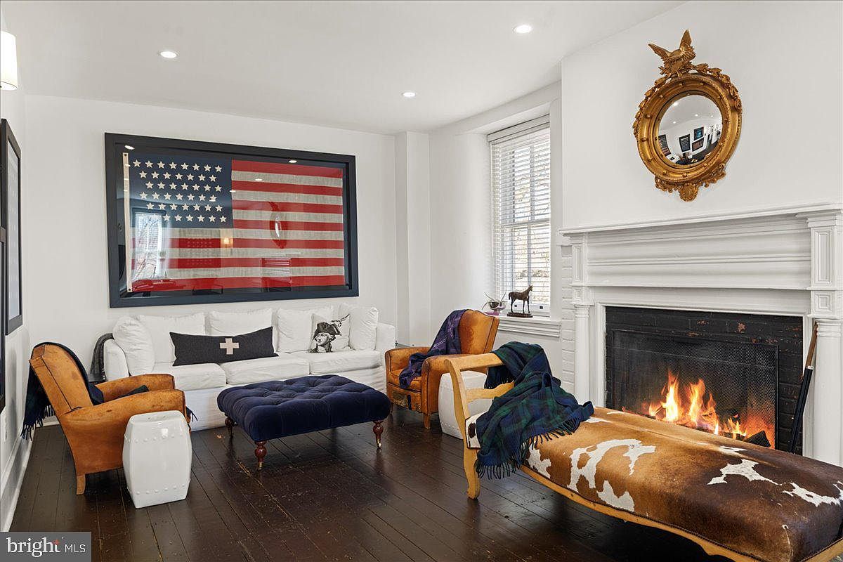 This inviting living room harmoniously blends classic elegance with modern comfort. A striking white fireplace, adorned with intricate mantling, serves as the room’s centerpiece, while a warm fire adds a cozy ambiance. Light streams in from the large windows, highlighting the rich, dark hardwood floors and soft neutral walls. A rustic cowhide accent chair paired with a wooden chaise lounge draped with a navy blanket invites relaxation. Art and decor, including framed star patterns and portraits, add layers of character, and the sculptural mirror above the fireplace reflects tasteful design touches, making this space perfect for gatherings or quiet evenings.